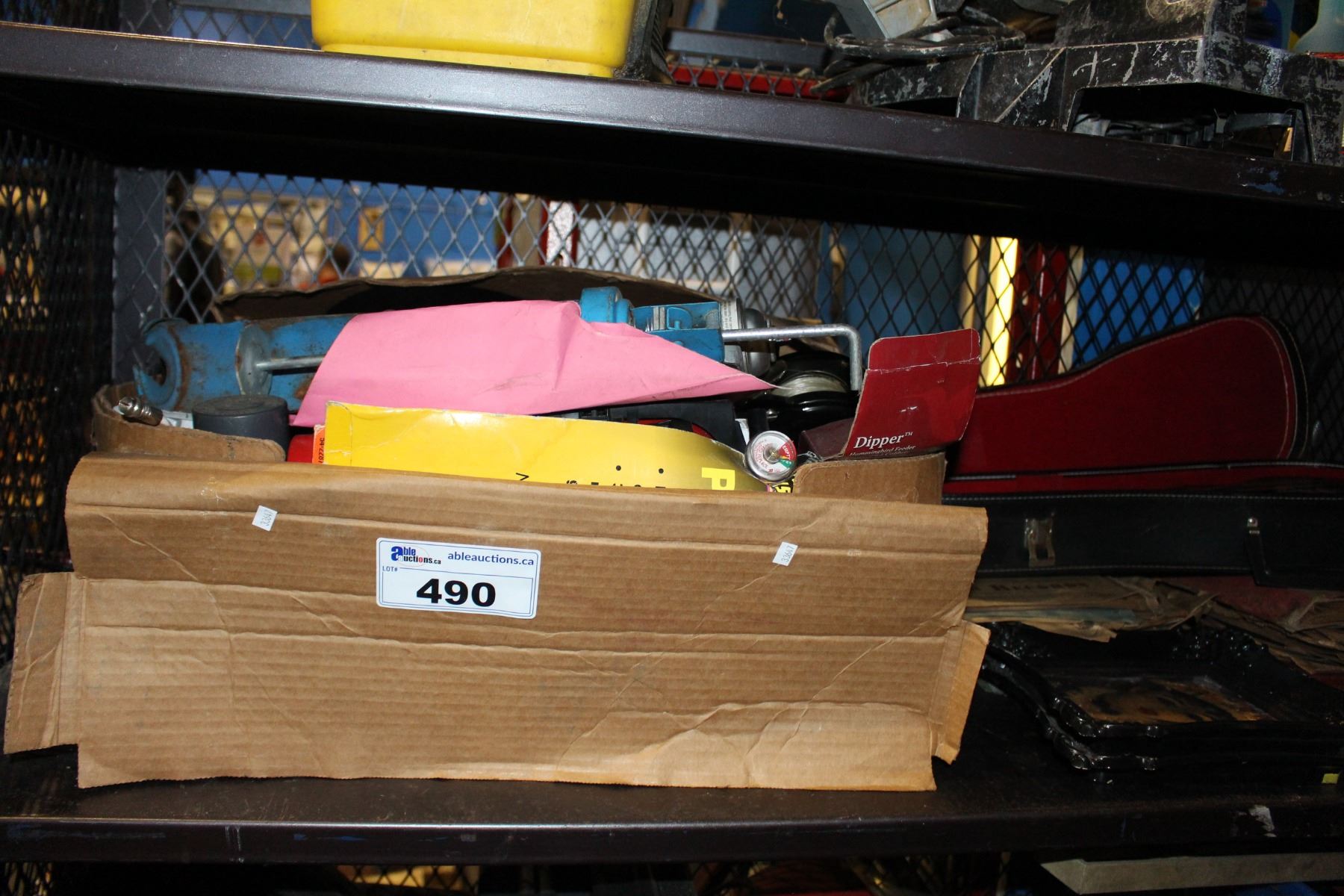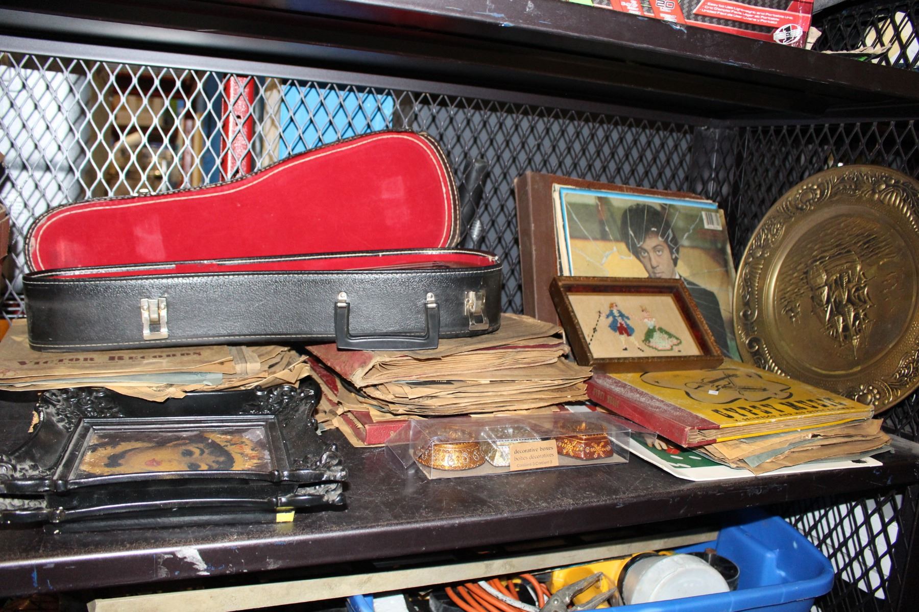 SHELF LOT INCLUDING VINTAGE RECORDS AND COLLECTABLES, OTHER SHOP ITEMS
