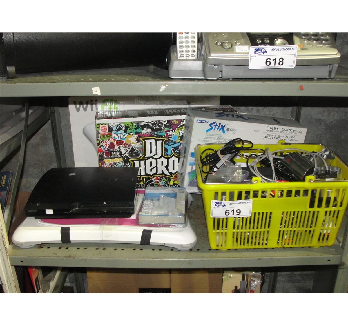 SHELF LOT INCLUDING WII FIT, SONY PLAYSTATION, MISC CAMERAS, DJ HERO AND OTHER ITEMS