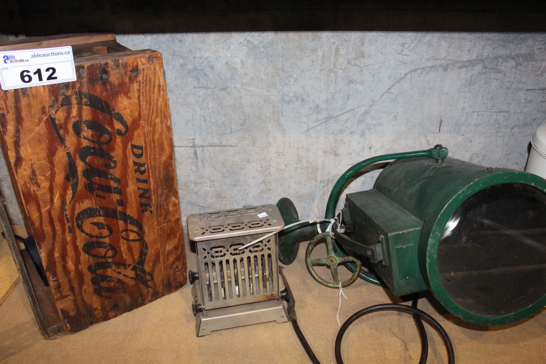 SHELF LOT INCLUDING WOODEN COCA COLA BOX, VINTAGE TOASTER, GARBAGE CAN AND SPOT LIGHT