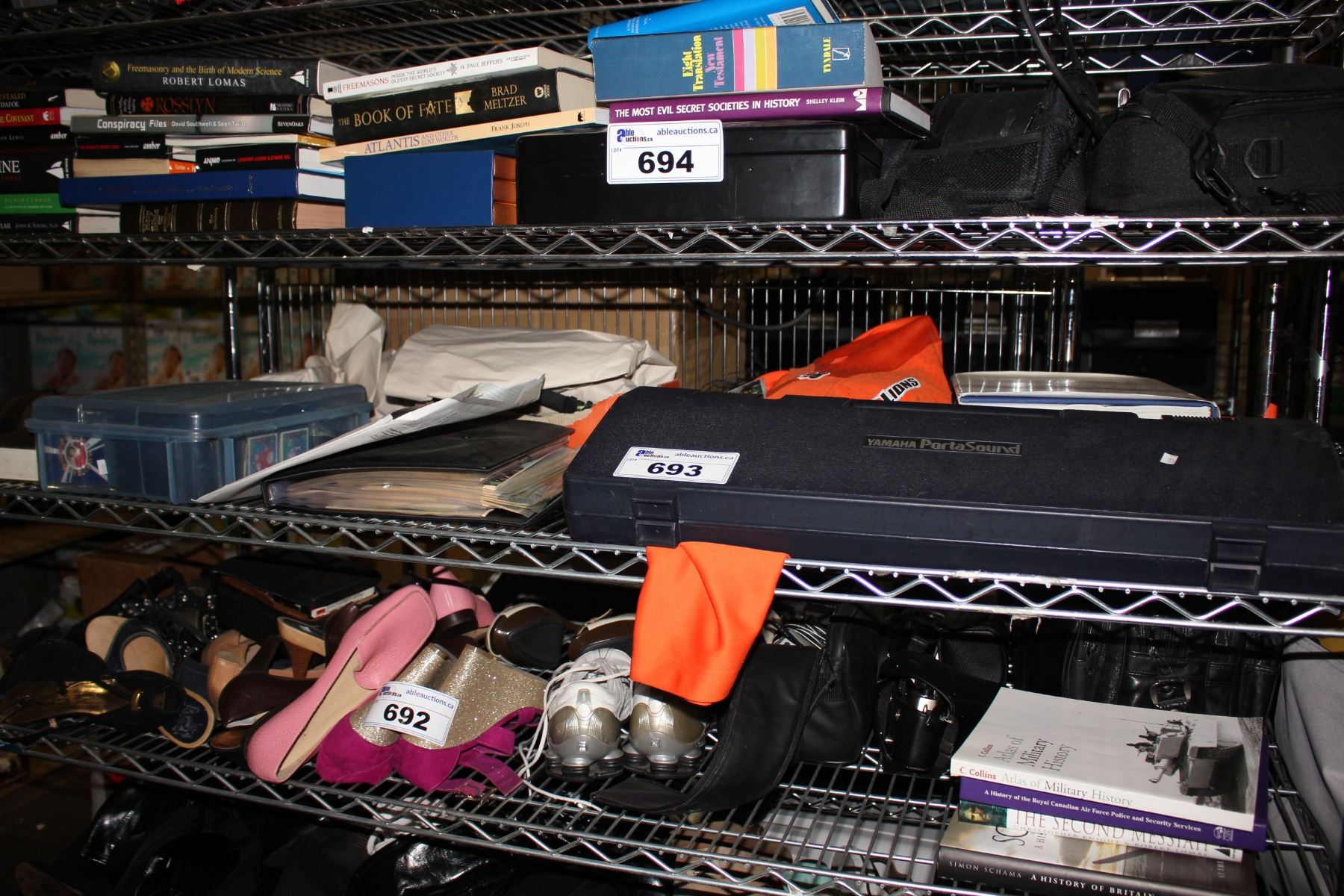 SHELF LOT INCLUDING YAMAHA KEYBOARD, COMIC COLLECTION, POKEMON CARD COLLECTION AND MORE