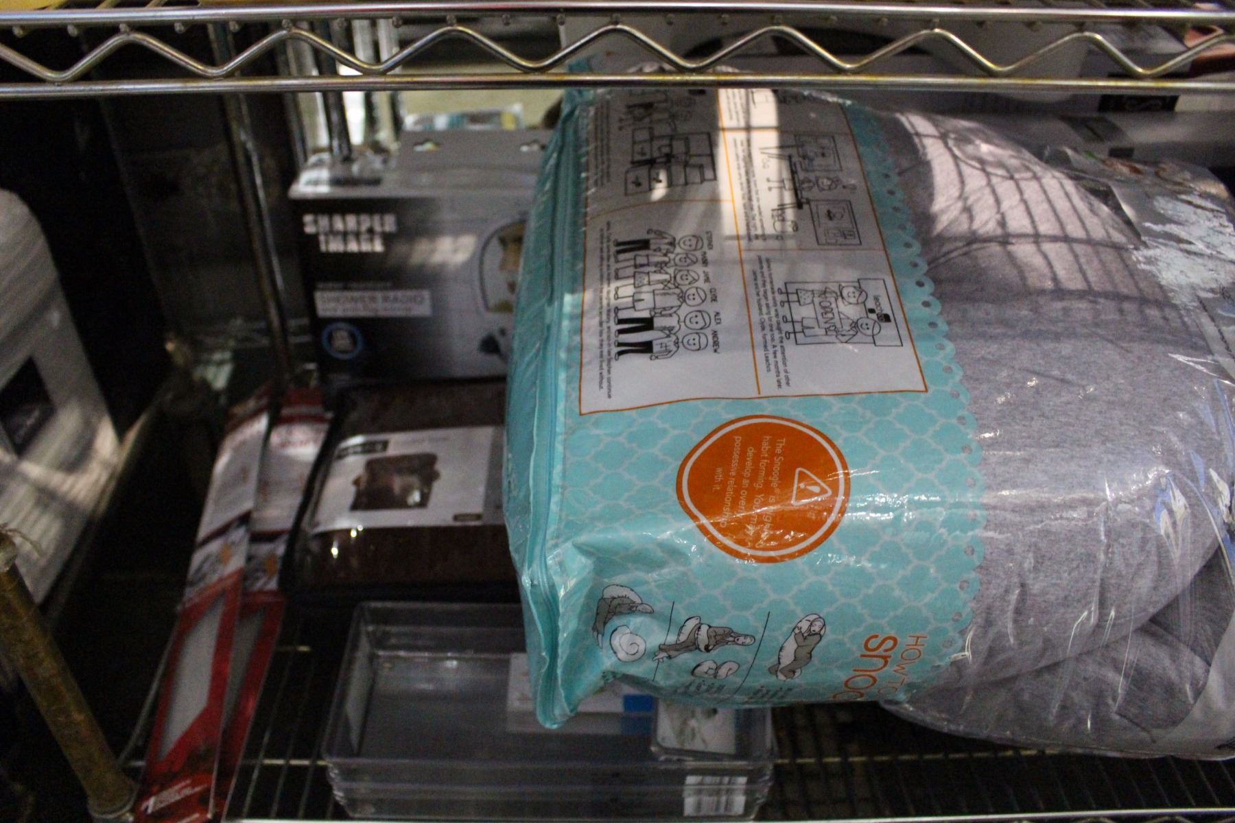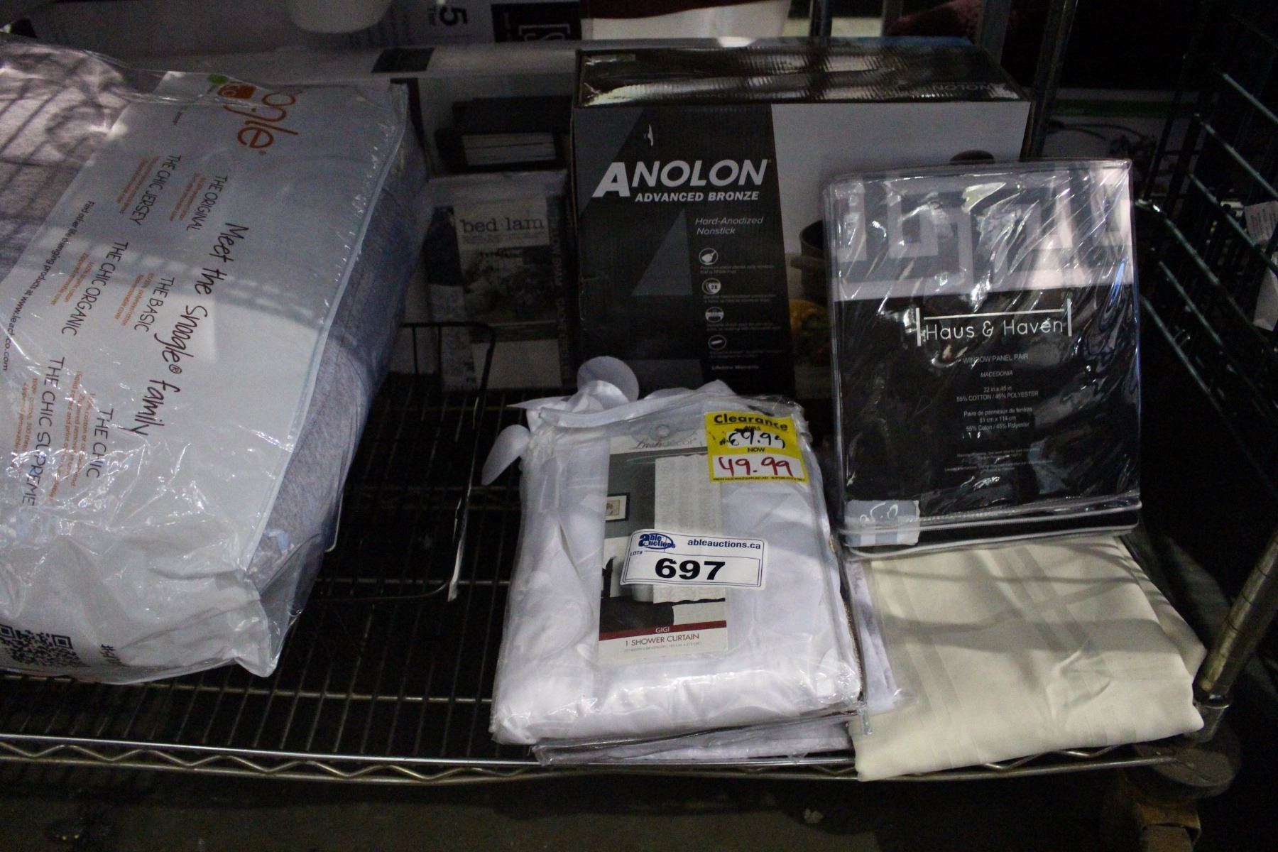 SHELF LOT - MIRROR/RADIO FOR SHOWER, MISC COOK WARE AND LINEN AND SLIPPERS