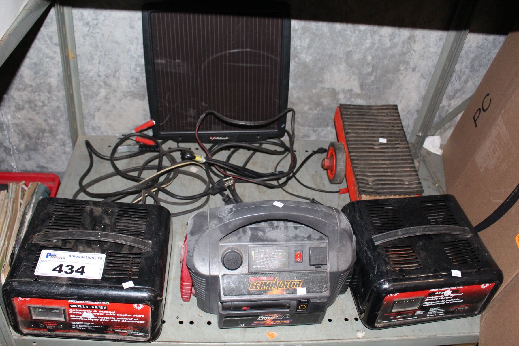 SHELF LOT OF 2 BATTERY CHARGERS AND SOLAR PANEL