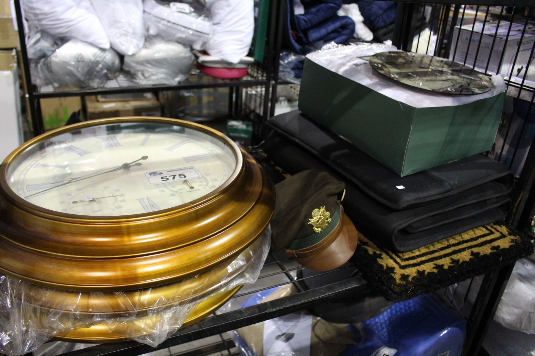 SHELF LOT OF 3 LARGE CLOCKS, FRONT ENTRANCE MAT AND MORE
