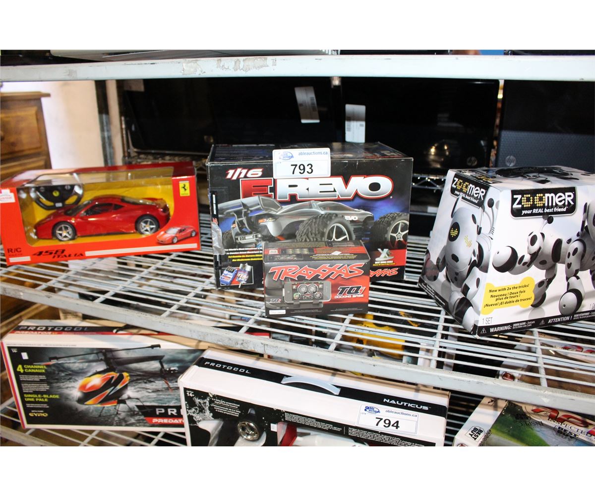 SHELF LOT OF 3 RADIO CONTROLLED TOYS; FERRARI, DUNE BUGGY, AND A ZOOMER DALMATION DOG