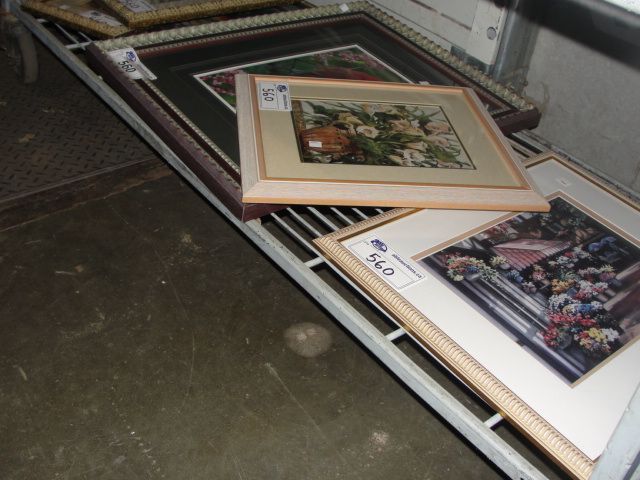SHELF LOT OF 6 ASSORTED FRAMED PICTURES AND PRINTS