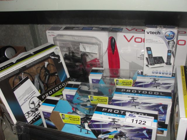 SHELF LOT OF 6 ASSORTED RADIO CONTROL HELICOPTERS, ONE CORDLESS PHONE AND ONE SPEAKER MOUNTING SET