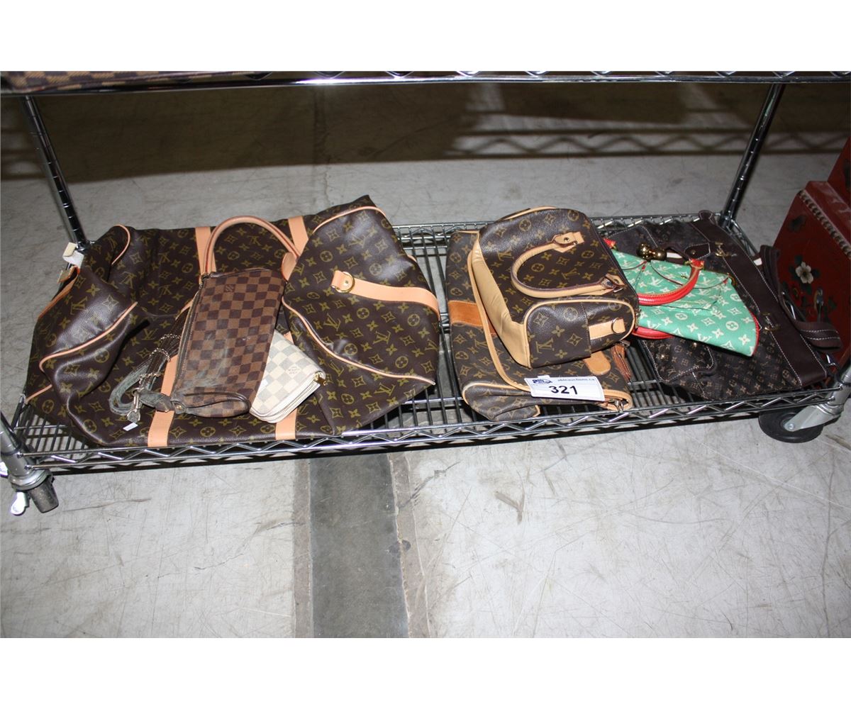 SHELF LOT OF 7 DESIGNER HAND BAGS AND WALLETS