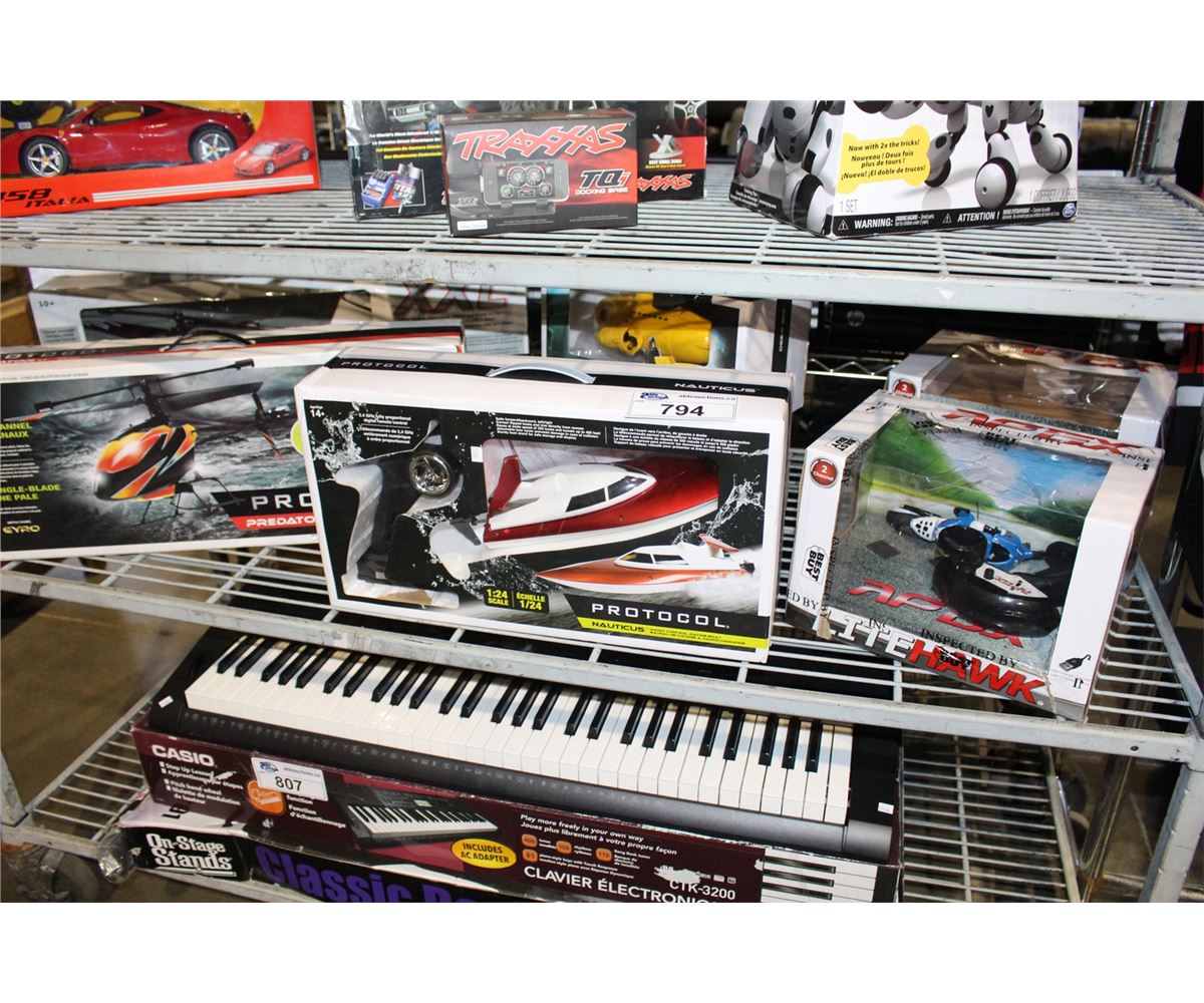 SHELF LOT OF 8 ASSORTED RADIO CONTROLLED TOYS; YELLOW SUBMARINE, MOTORCYCLE, HELICOPTERS, ETC