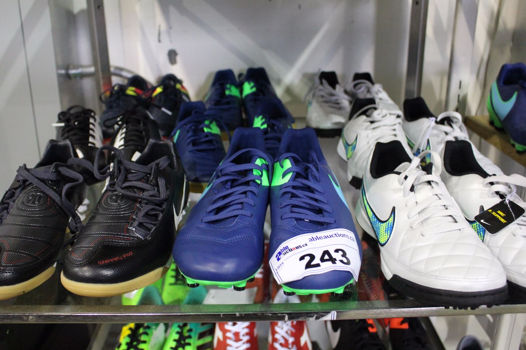 SHELF LOT OF 9 PAIRS OF CHILDRENS CLEATS SIZES 2.5 TO 6 YOUTH