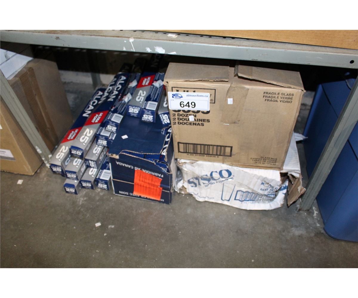 SHELF LOT OF ALCAN ALUMINUM FOIL AND 2 CASES OF DRINKING GLASSES