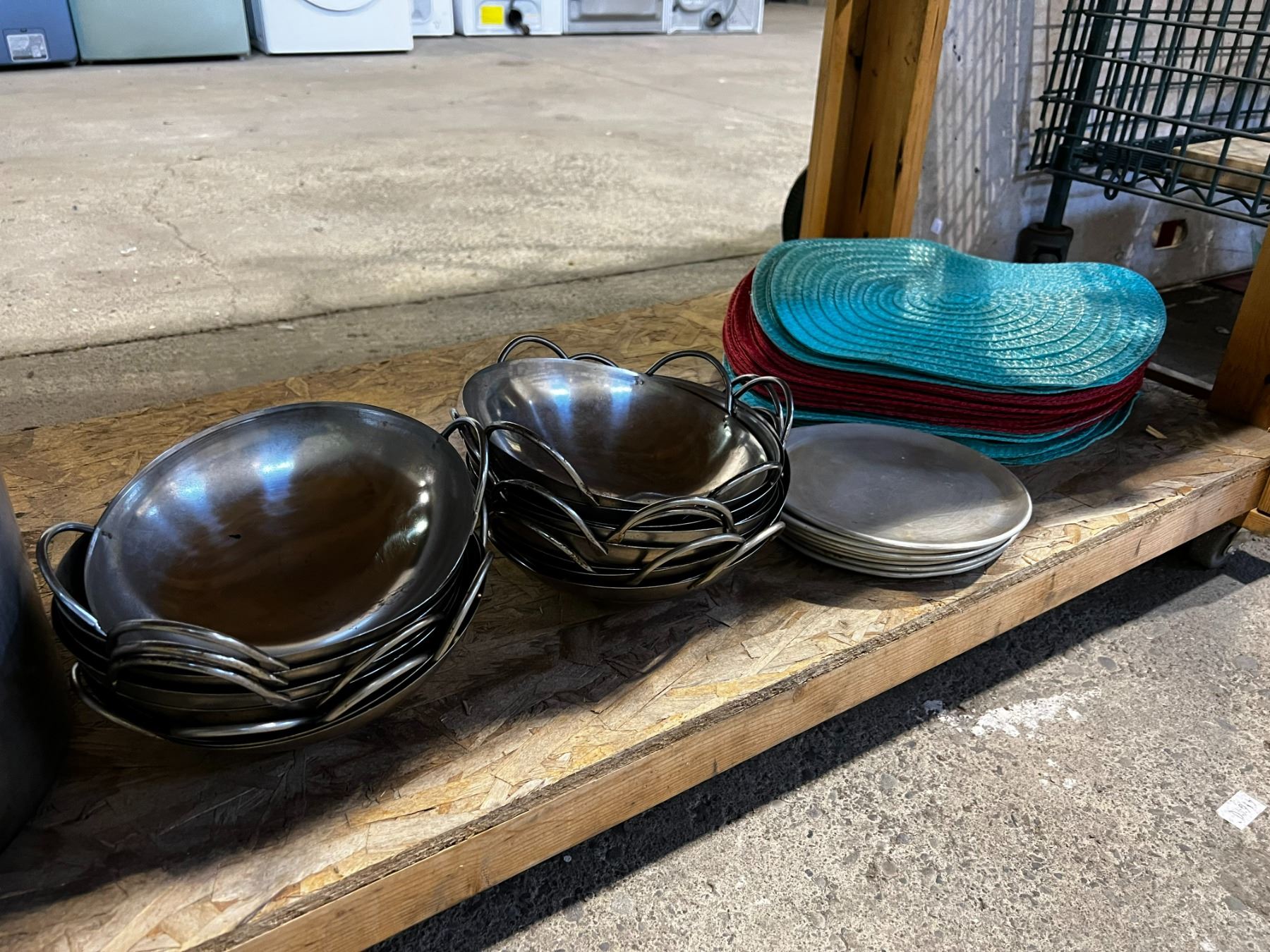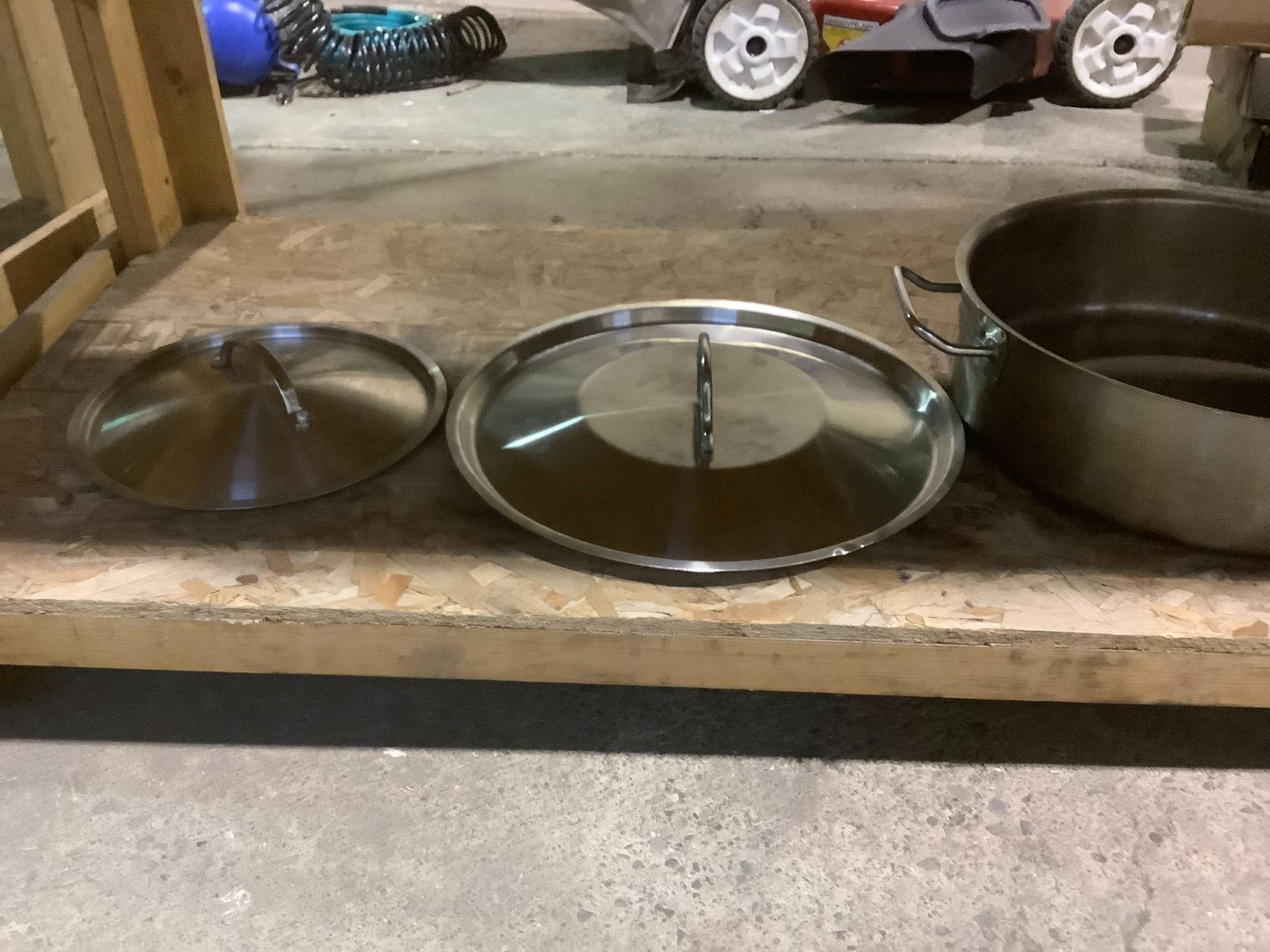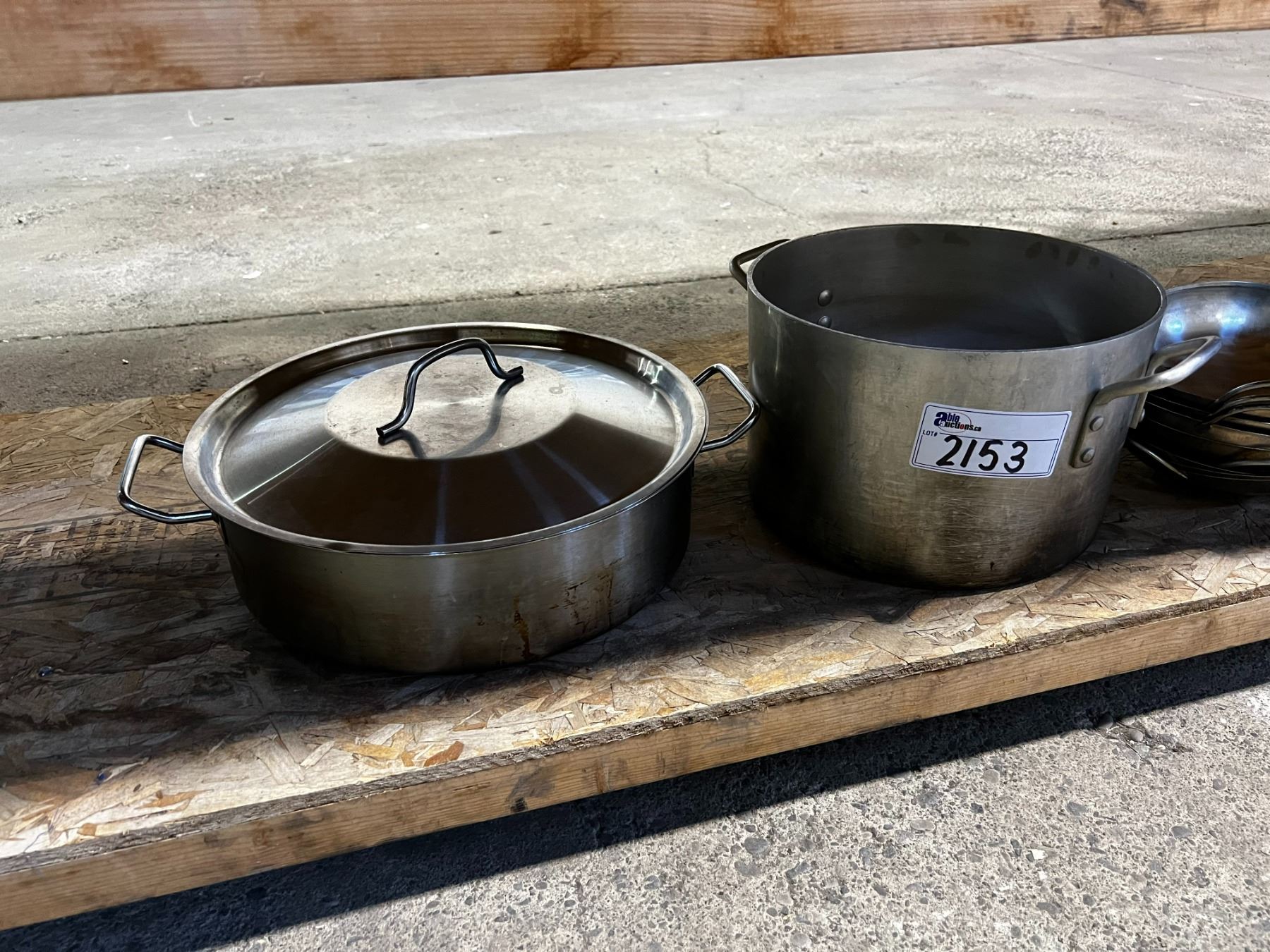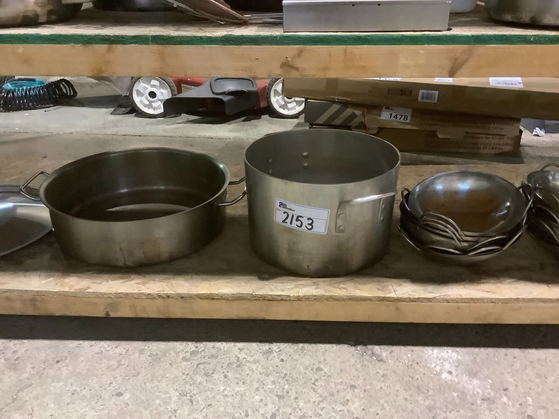 SHELF LOT OF ALUMINUM POTS, LIDS, DISHES, AND MORE