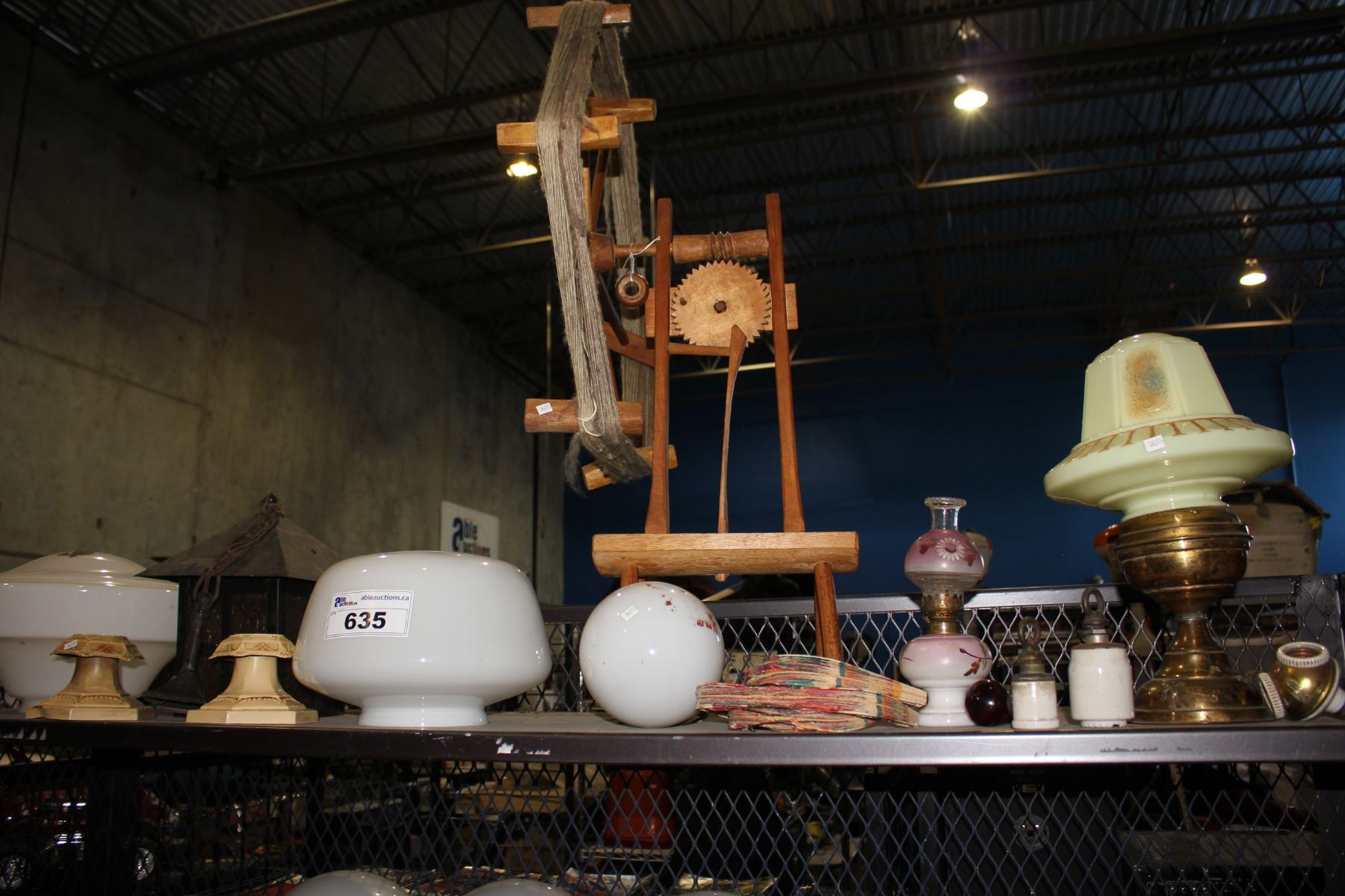 SHELF LOT OF ANTIQUE COLLECTABLES INCLUDING LIGHT COVERS, SPINNER AND MORE