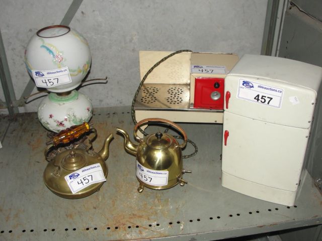 SHELF LOT OF ANTIQUE PIECES; GLASS LAMP, TOY STOVE AND FRIDGE, AND 2 BRASS KETTLES
