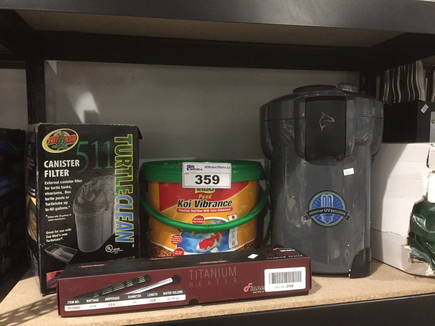 SHELF LOT OF AQUARIUM PRODUCTS- FILTER, HEATER ECT.