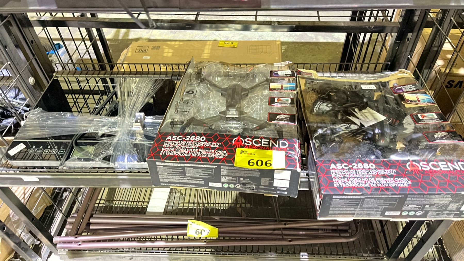 SHELF LOT OF ASCEND AERONAUTICS VIDEO DRONES AND SALTON INDUCTION HOT PLATE *UNKNOWN WORKING CONDITION/ MAY BE MISSING PIECES*