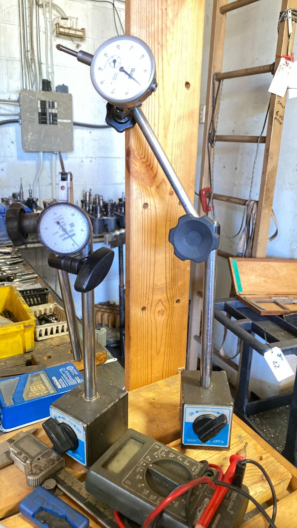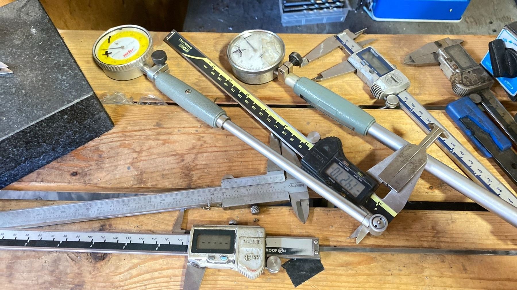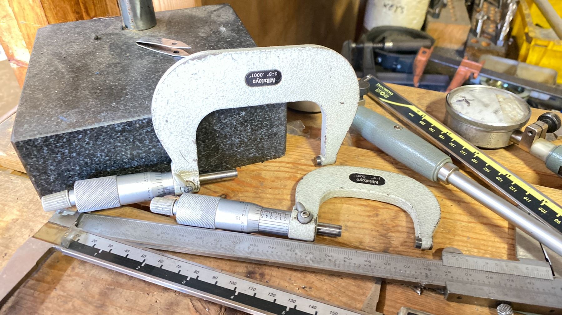 SHELF LOT OF ASSORT MACHINIST PRECISION TOOLS-DIAL GAUGES MICROMETERS ETC