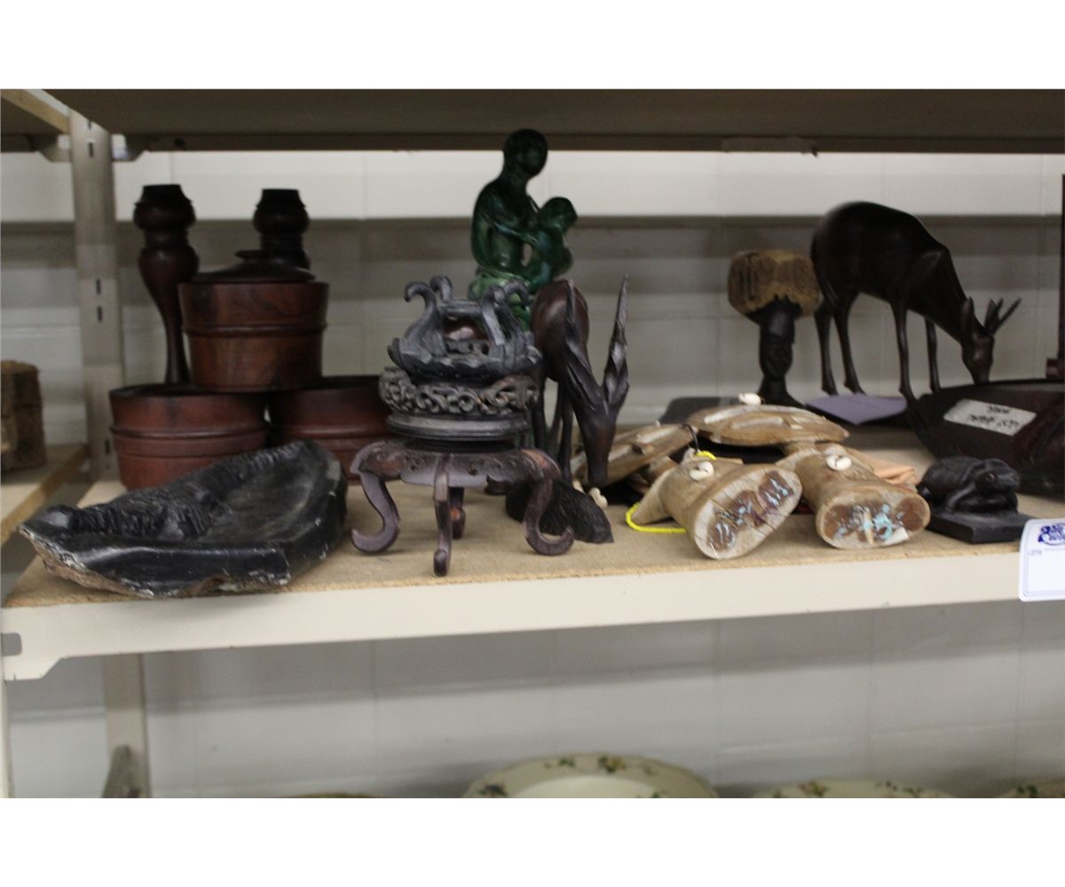 SHELF LOT OF ASSORTED AFRICAN MASKS, CARVINGS AND MORE!