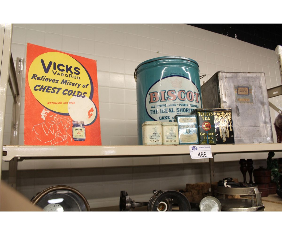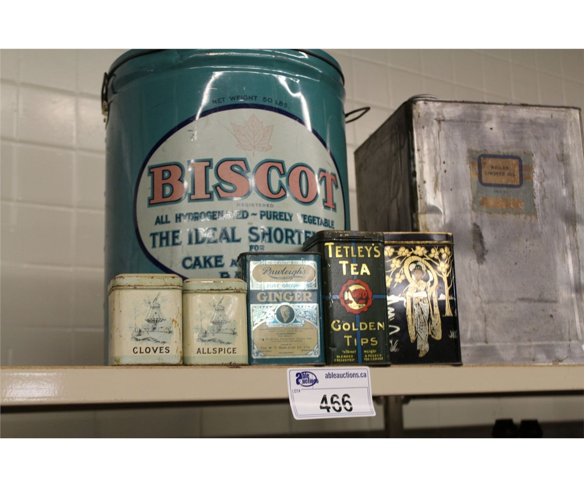 SHELF LOT OF ASSORTED ANTIQUE ADVERTISING TINS