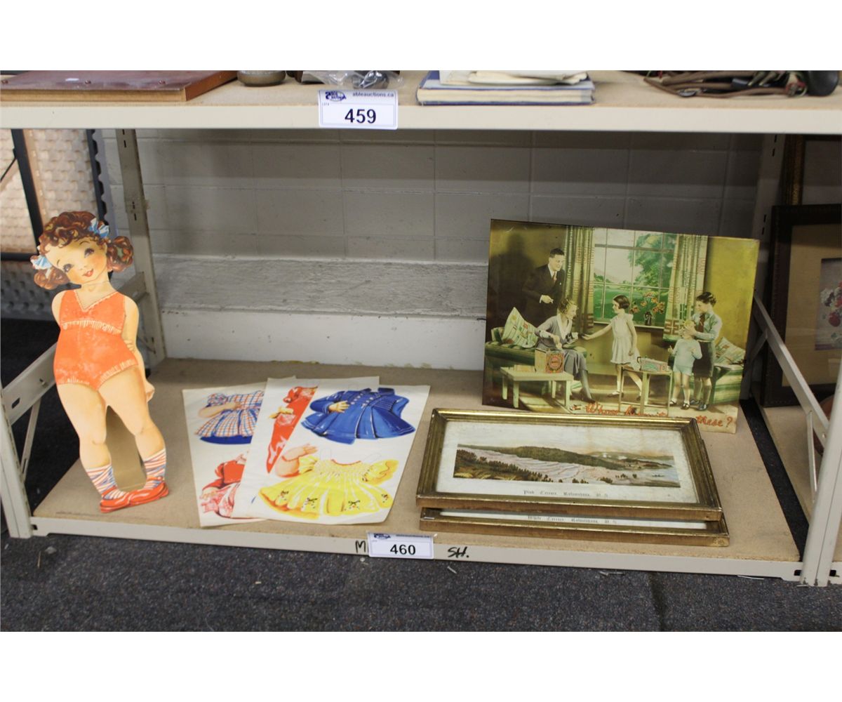 SHELF LOT OF ASSORTED ANTIQUE DOLL ADVERTISING AND ARTWORK