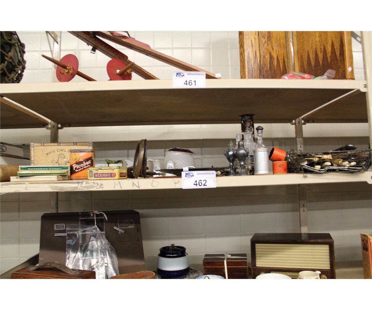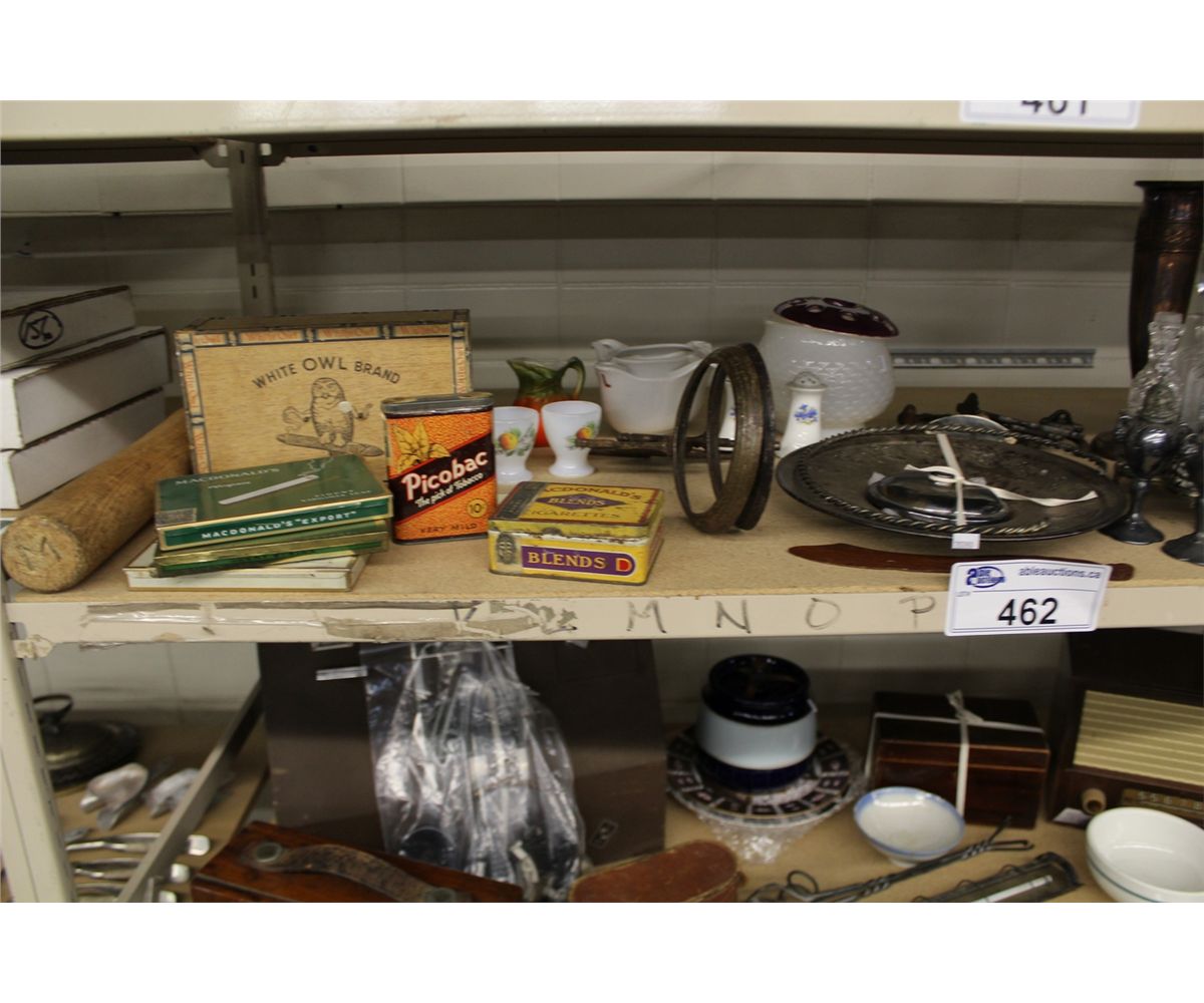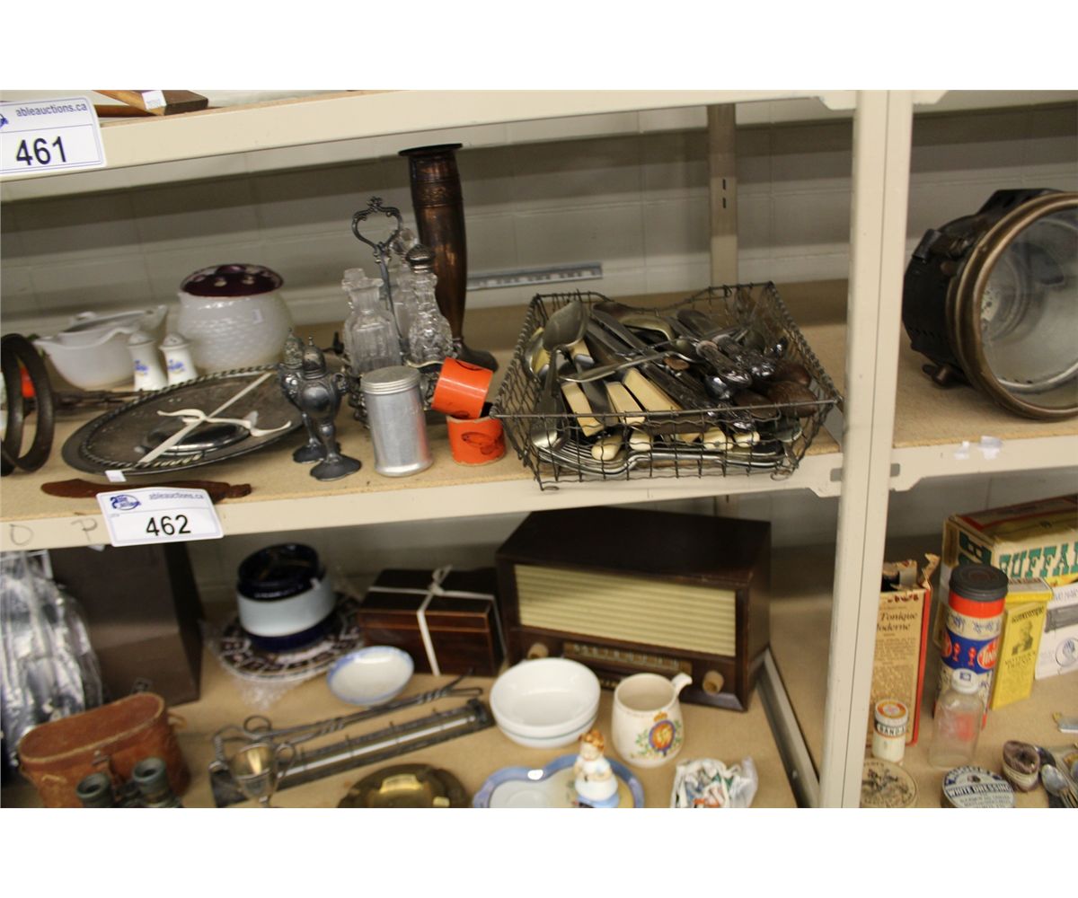 SHELF LOT OF ASSORTED ANTIQUE FRENCH IVORY FLATWARE, SILVER PLATED FLATWARE, TOBACCO TINS AND MORE!