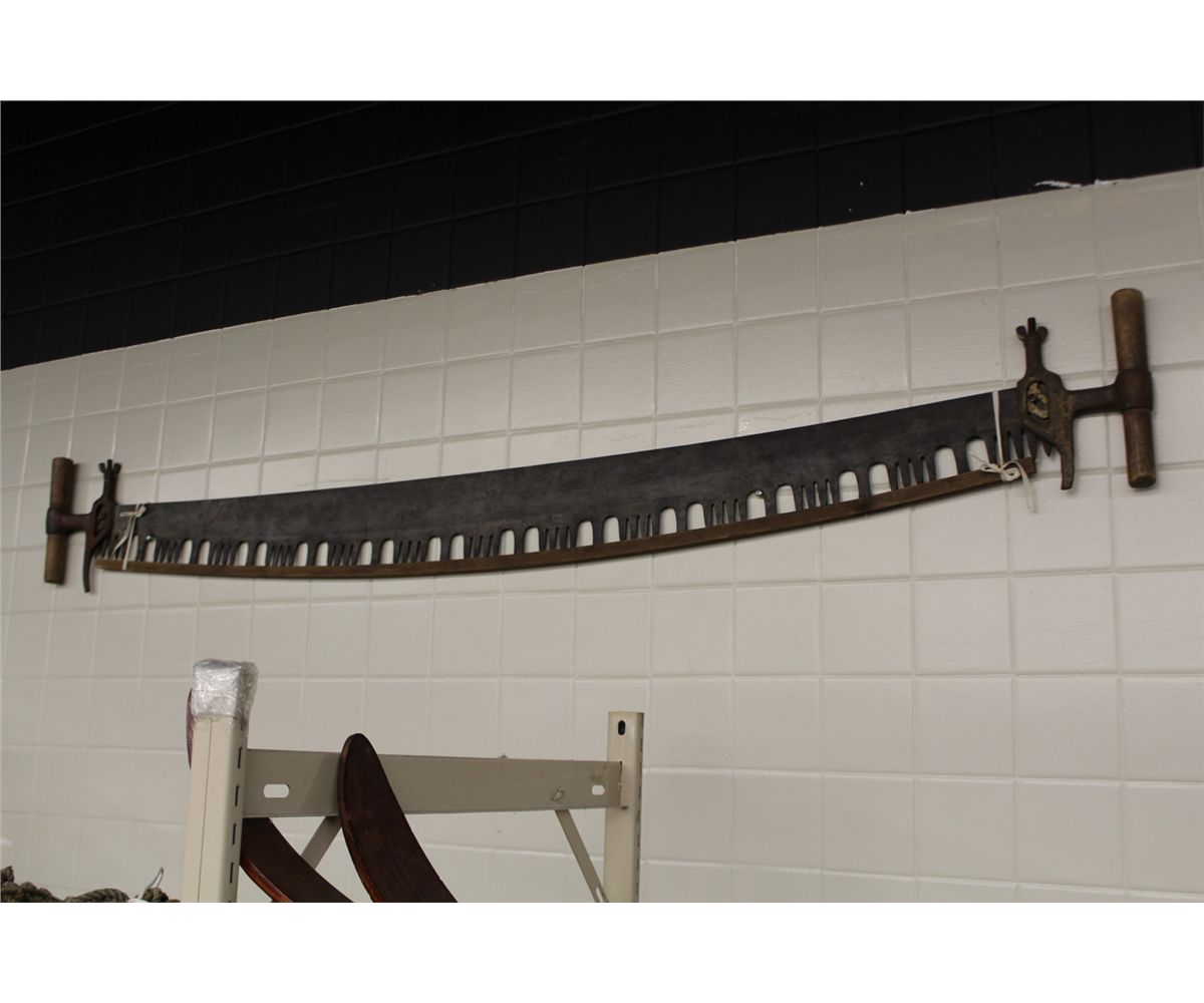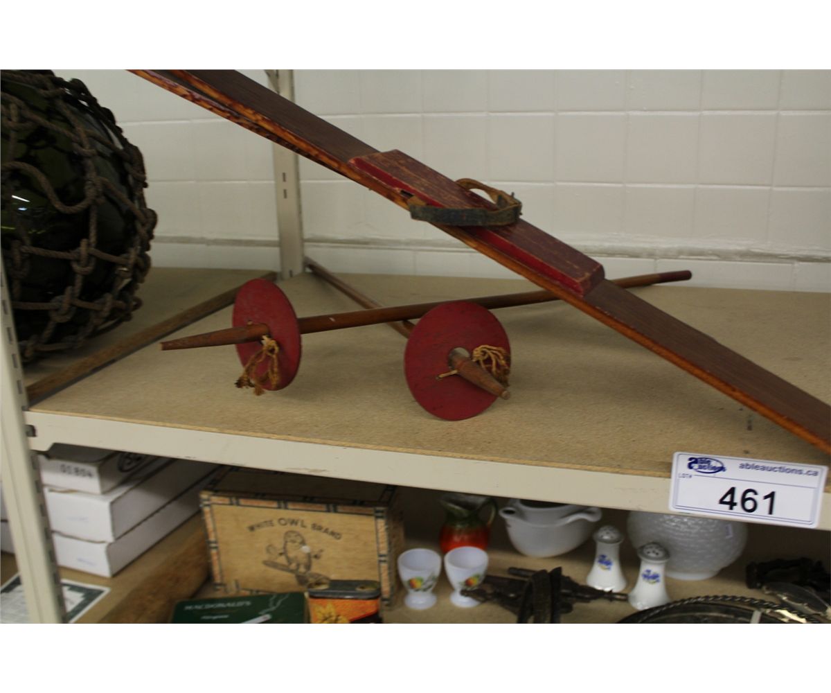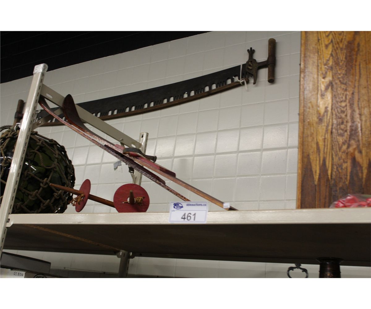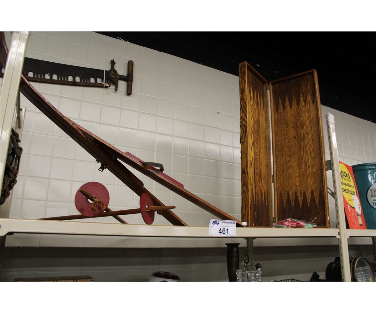 SHELF LOT OF ASSORTED ANTIQUE WOODEN SKIS, POLES AND BACKGAMMON GAME PLUS ANTIQUE WOODEN SAW