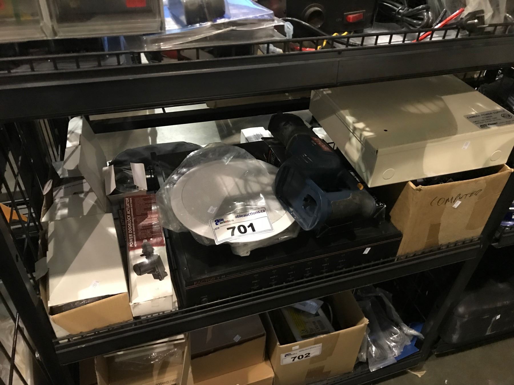 SHELF LOT OF ASSORTED AUDIO PARTS, SPEAKERS, AMPLIFIER