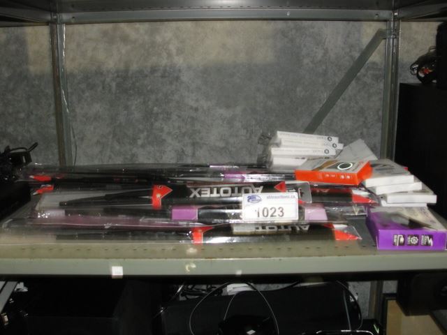 SHELF LOT OF ASSORTED AUTOMOBILE WINDSHIELD WIPERS, KEY TRACKERS, SLEEP SPORTS BANDS ETC
