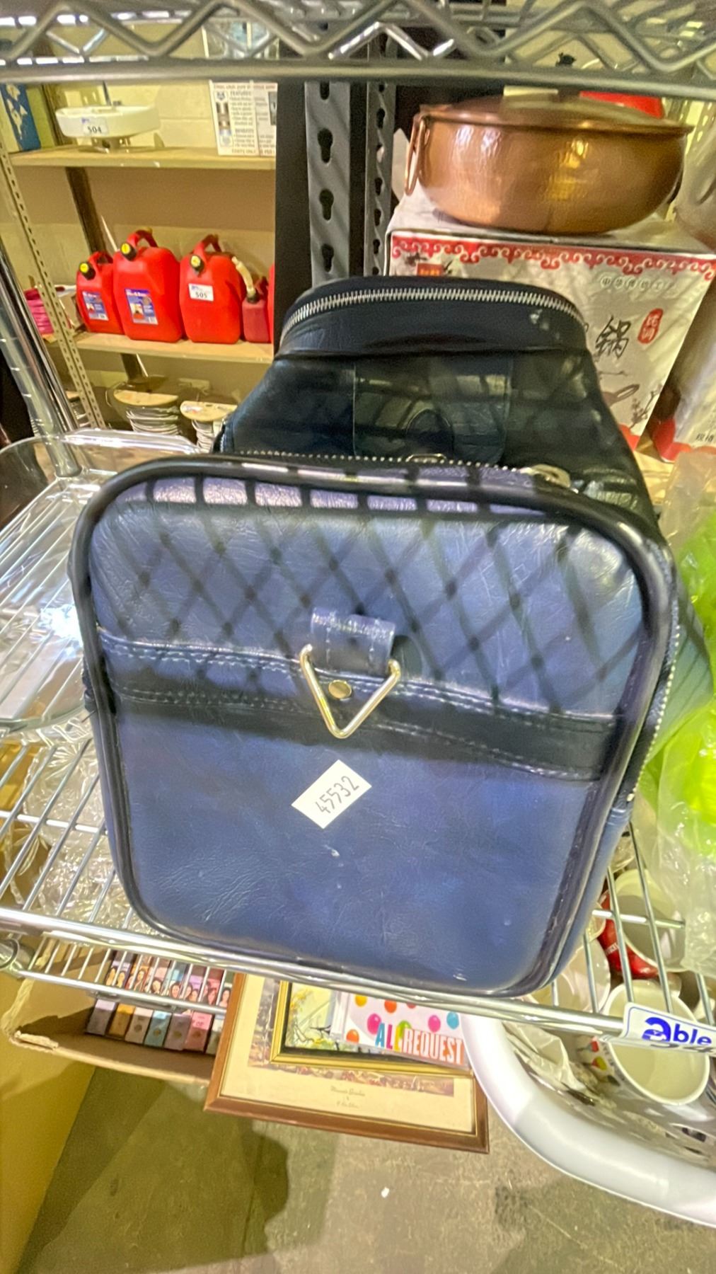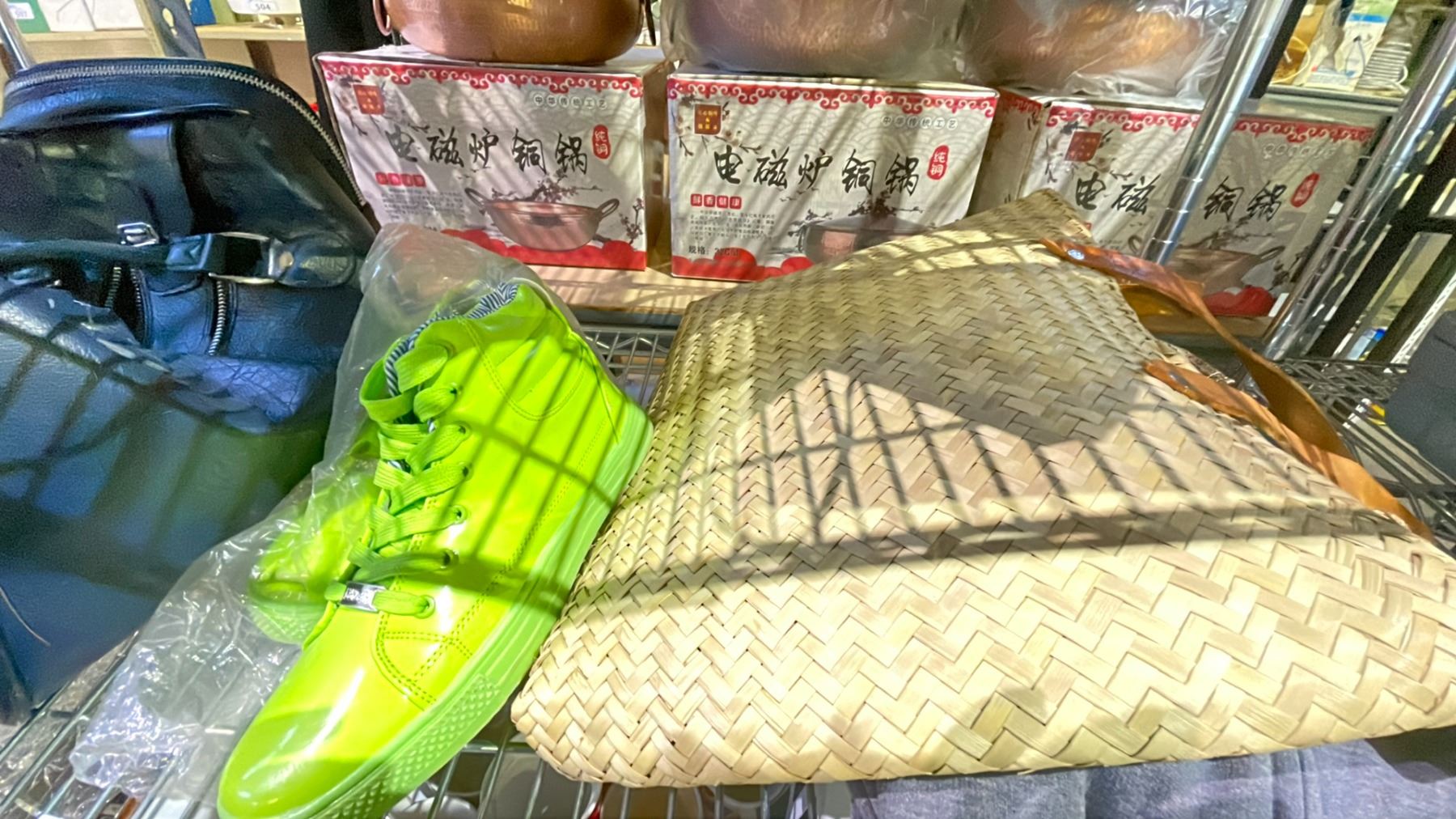 SHELF LOT OF ASSORTED BAGS, CLOTHING, SHOES AND MORE