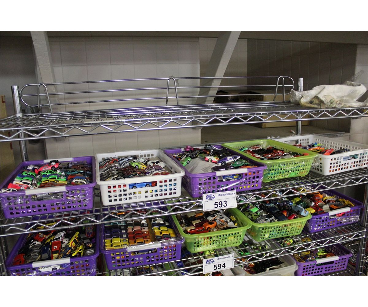 SHELF LOT OF ASSORTED BASKETS CONTAINING VINTAGE TO NEWER (1960'S-90'S) DIE CAST