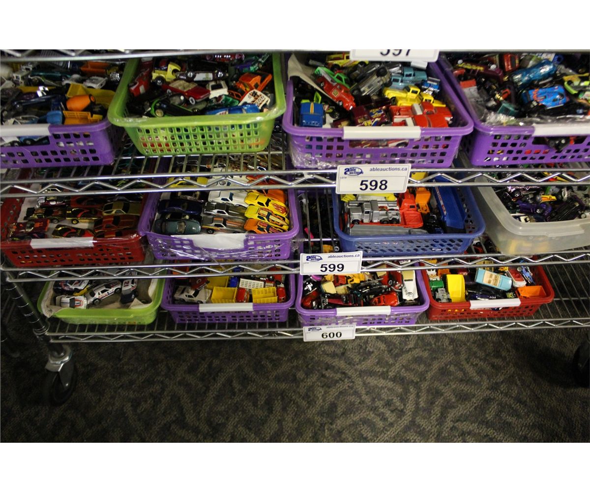 SHELF LOT OF ASSORTED BASKETS CONTAINING VINTAGE TO NEWER (1960'S-90'S) DIE CAST