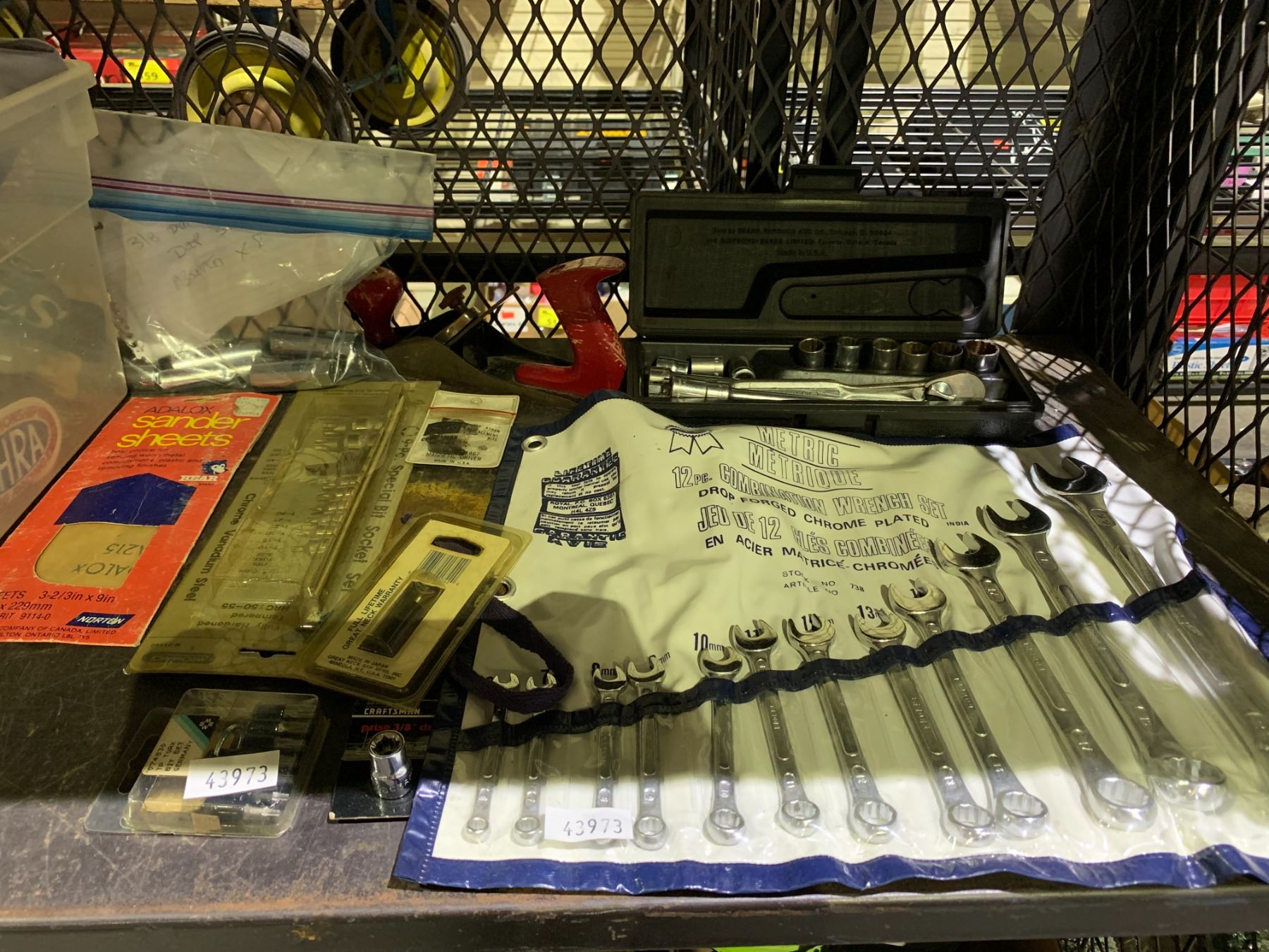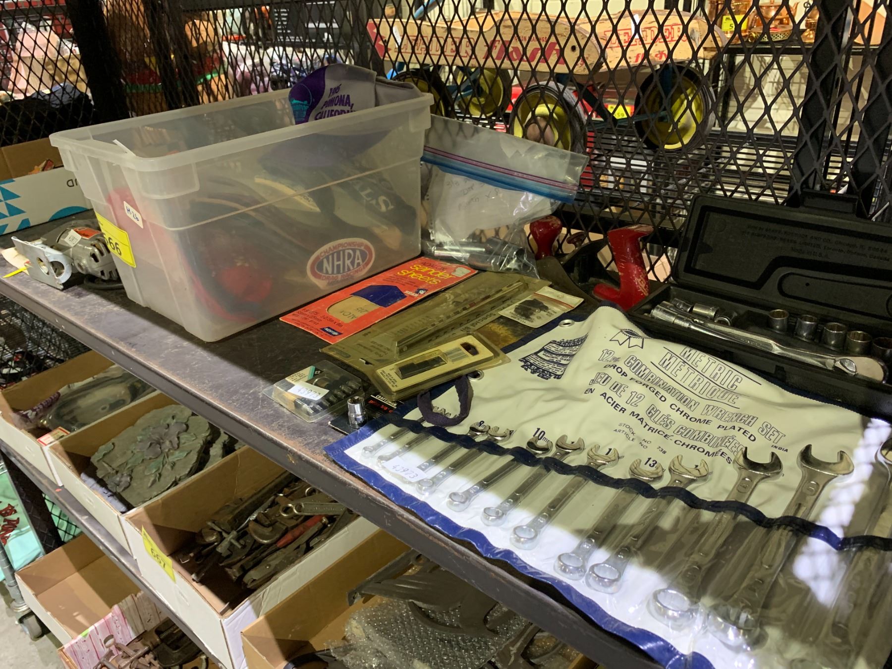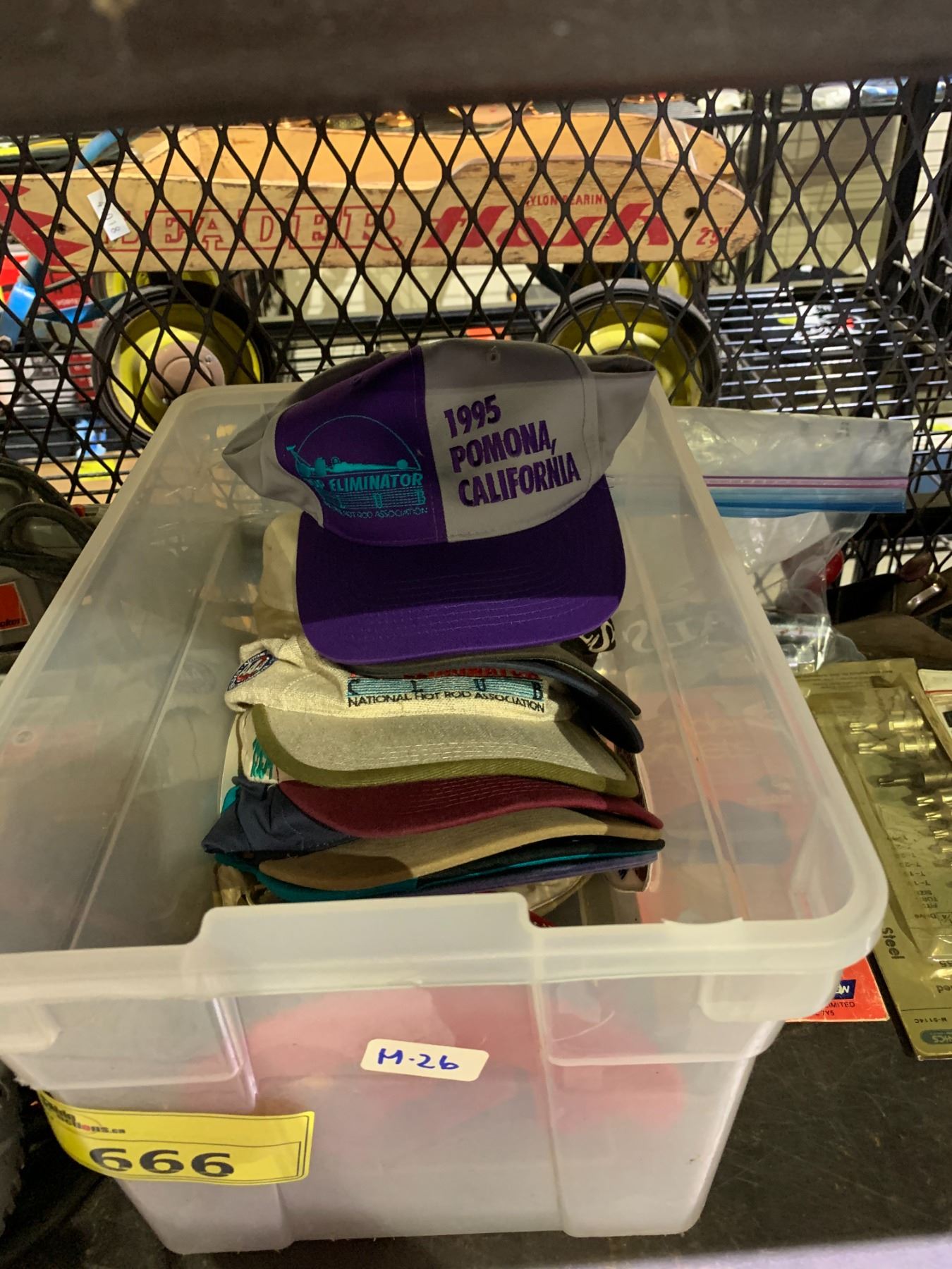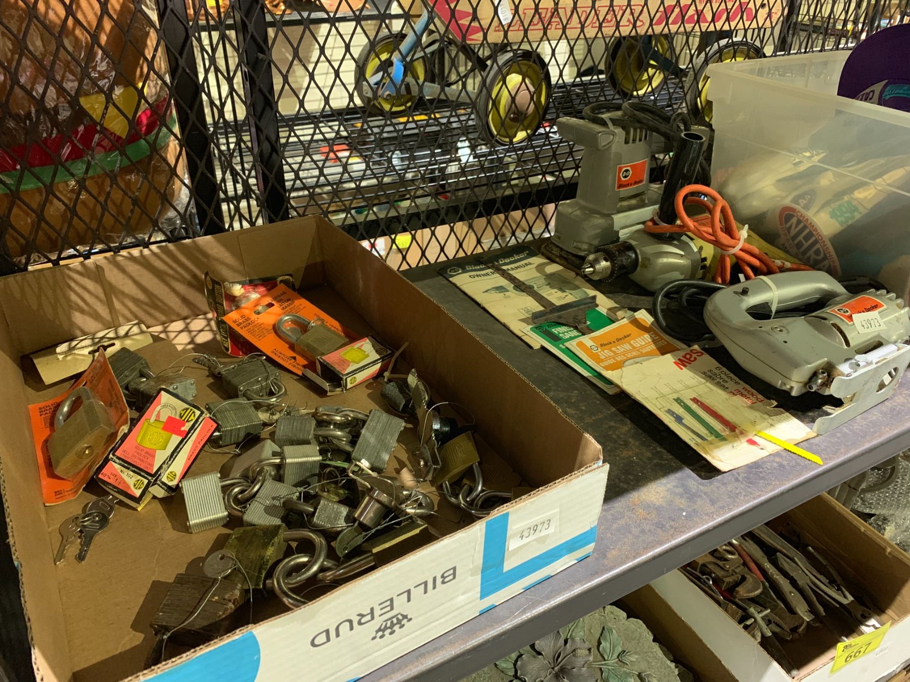 SHELF LOT OF ASSORTED BLACK AND DECKER TOOLS, HATS AND PAD LOCKS AND MORE