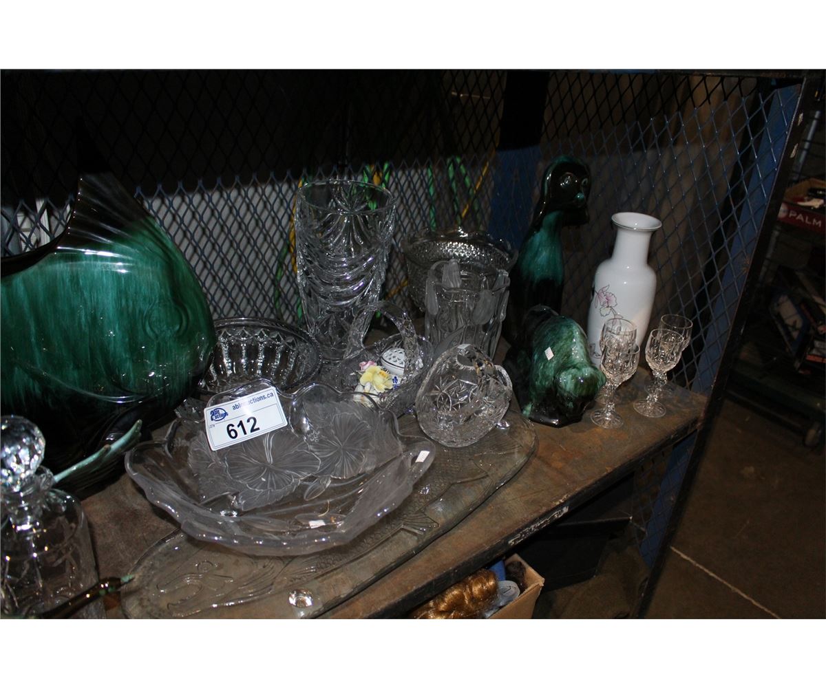 SHELF LOT OF ASSORTED BLUE MOUNTAIN POTTERY, CRYSTAL AND HOUSEHOLD ITEMS
