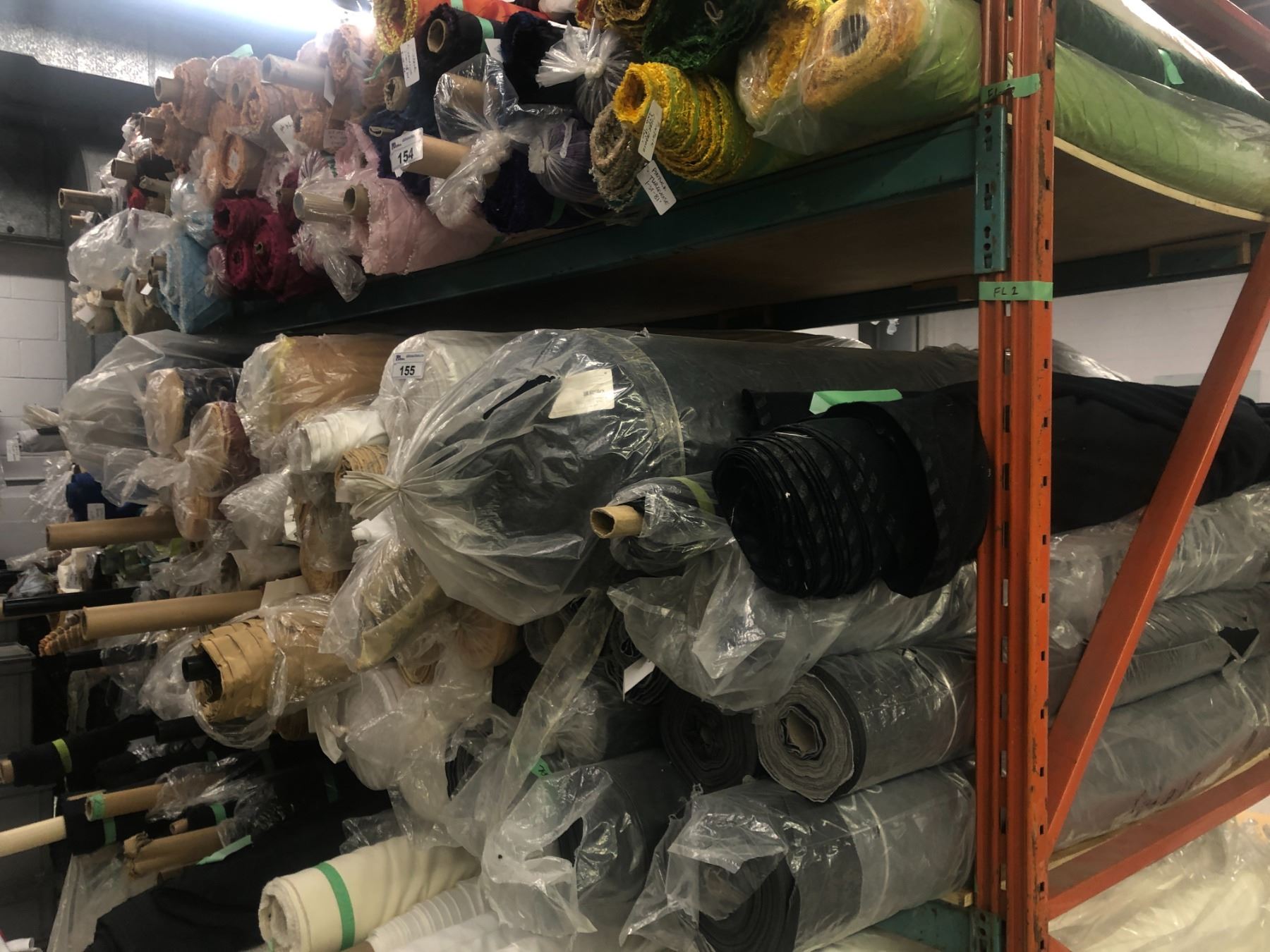 SHELF LOT OF ASSORTED BOLTS OF FABRIC, VARIOUS SIZES, QUANTITIES, MATERIALS, COLOURS ETC.