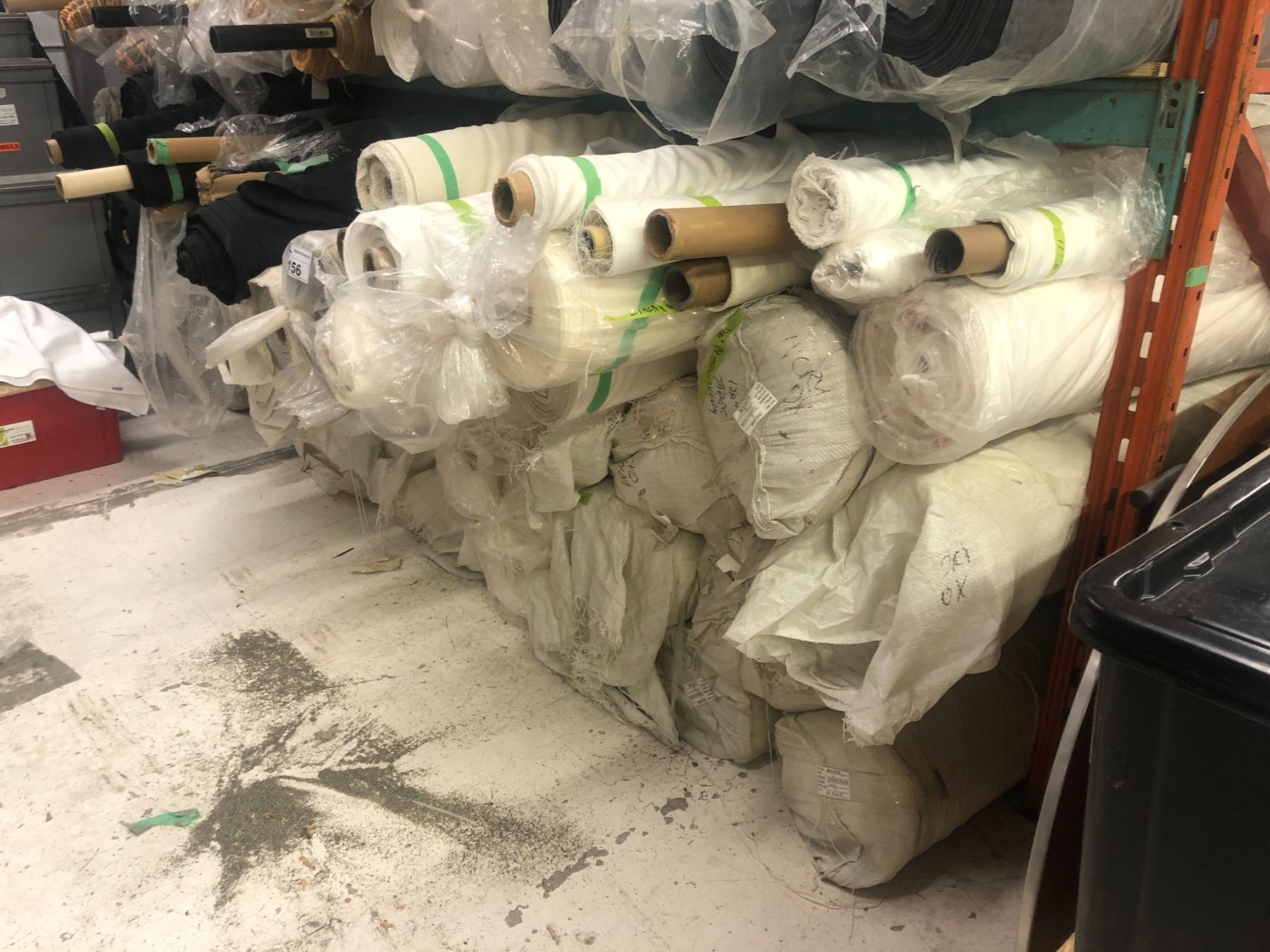 SHELF LOT OF ASSORTED BOLTS OF FABRIC, VARIOUS SIZES, QUANTITIES, MATERIALS, COLOURS ETC.