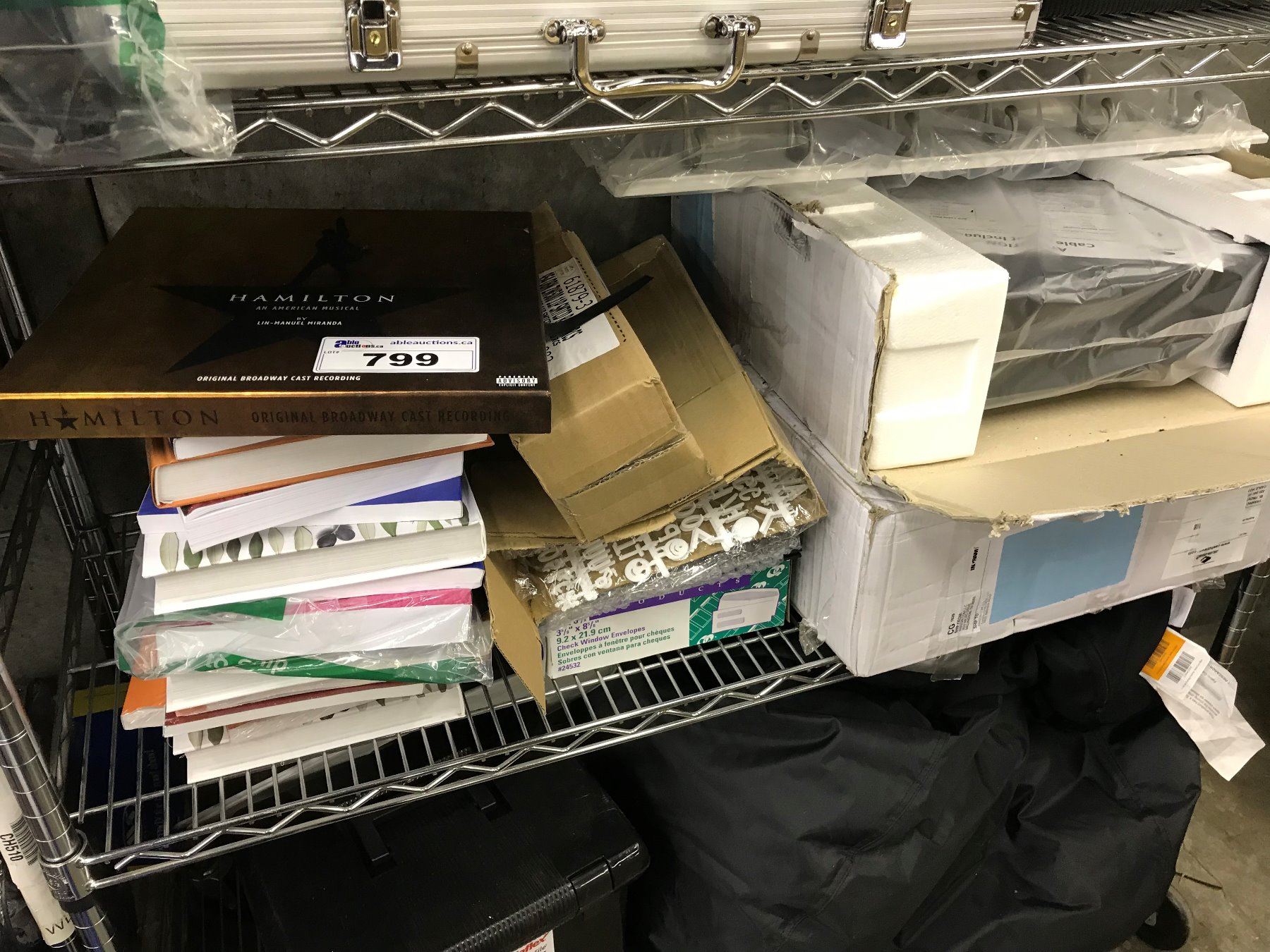 SHELF LOT OF ASSORTED BOOKS, RECORDS AND HOUSEHOLD PRODUCTS