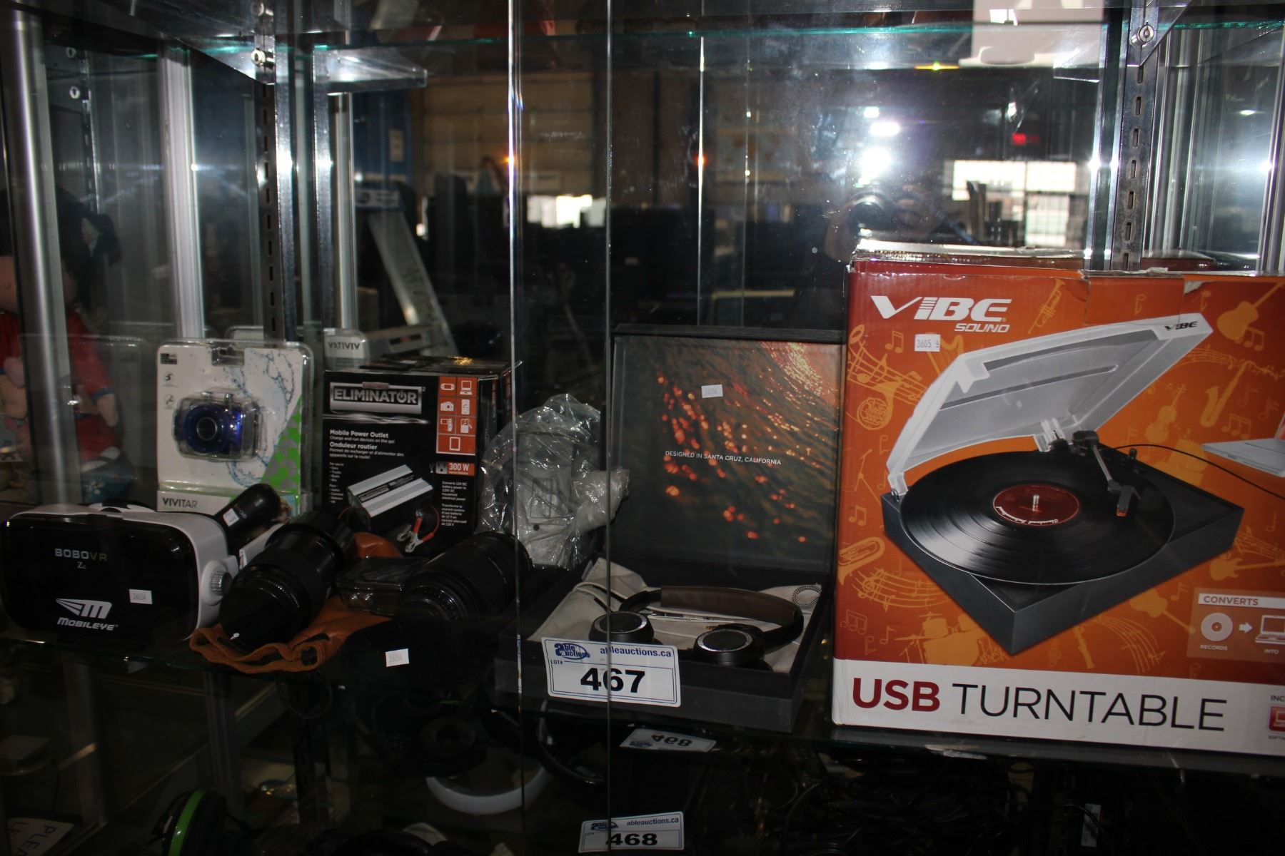 SHELF LOT OF ASSORTED CAMERA LENSES, HEADPHONES, TURNTABLE & MORE