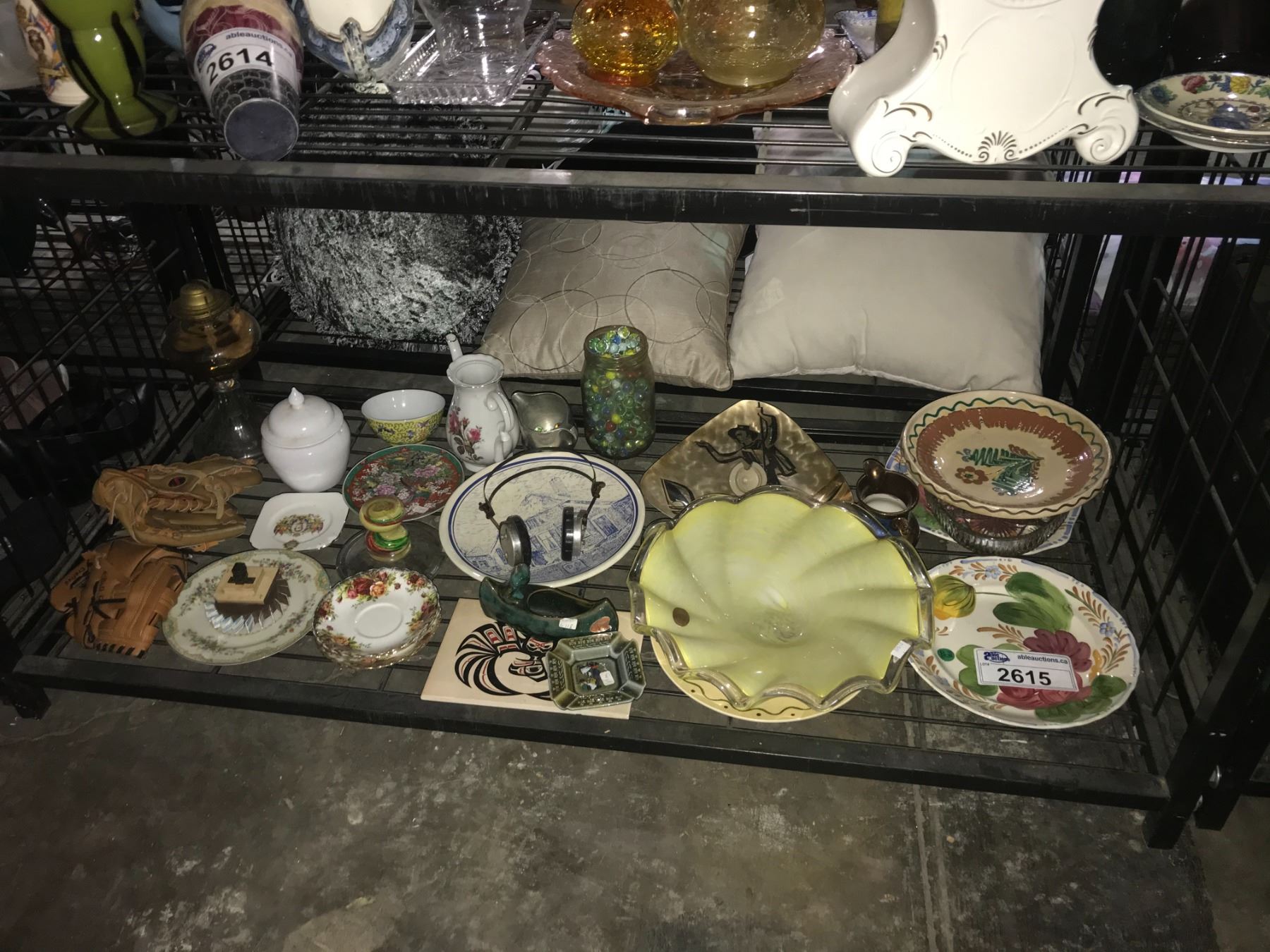 SHELF LOT OF ASSORTED CHINA, PLATES, AND MORE