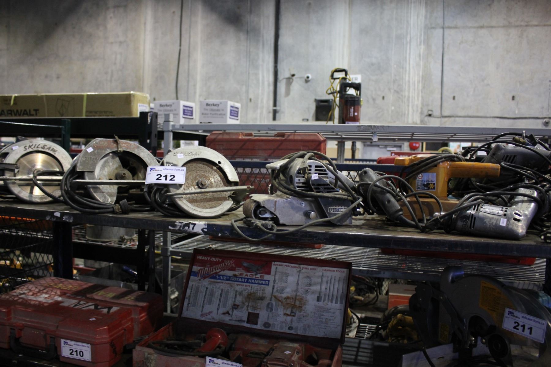 SHELF LOT OF ASSORTED CIRCULAR SAWS & POWER TOOLS