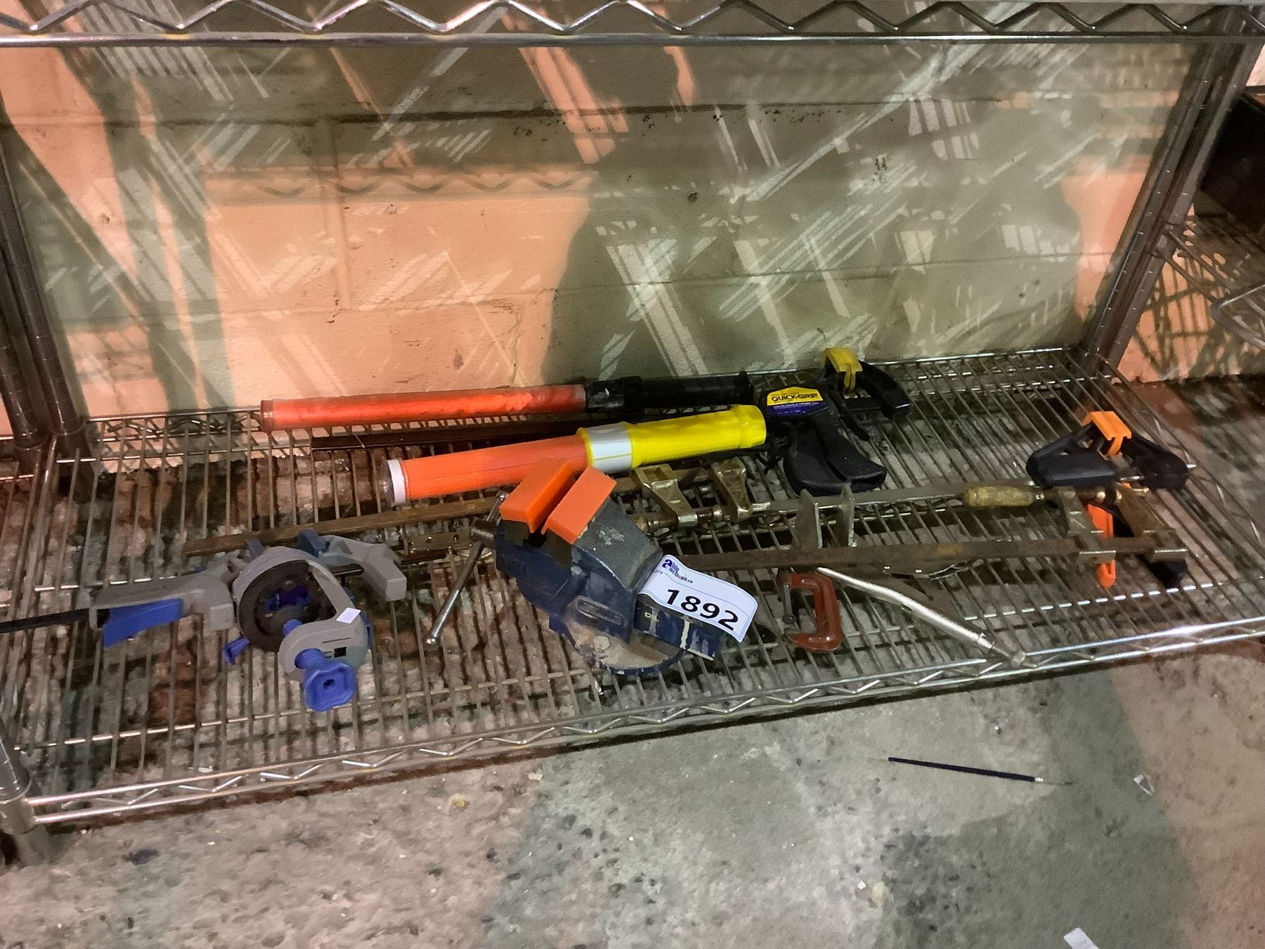 SHELF LOT OF ASSORTED CLAMPS INCLUDING; QUICKGRIP BARCLAMP, TABLETOP SHOP VICE GRIP, MULTIGRIP TOOL
