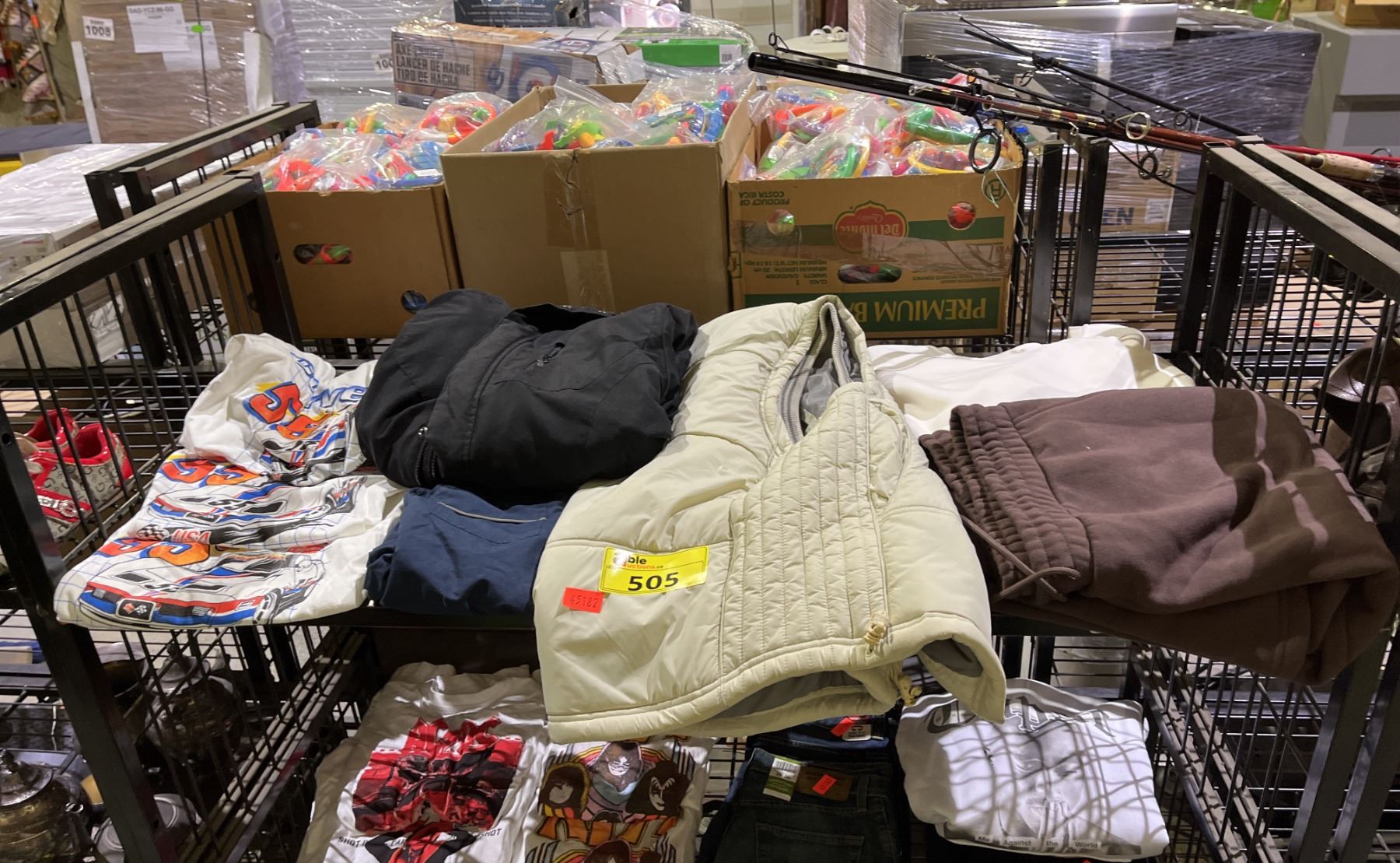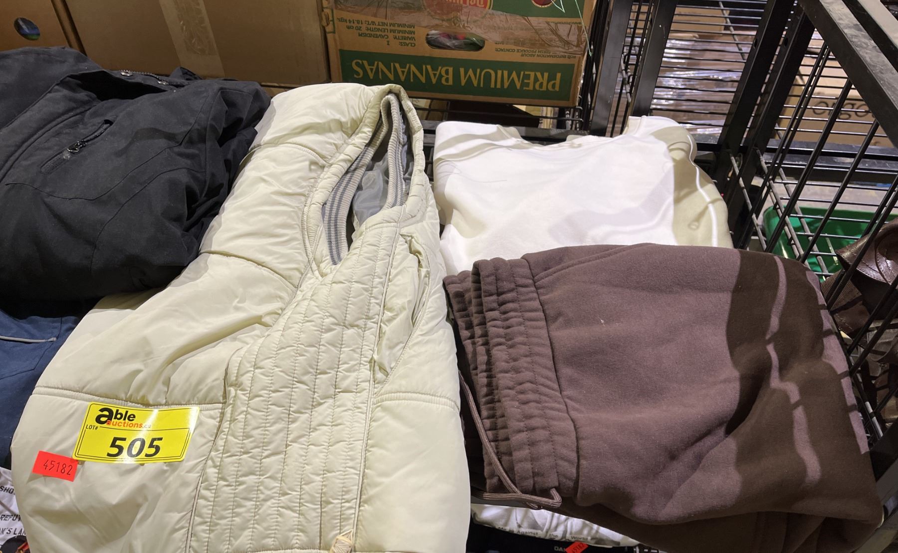 SHELF LOT OF ASSORTED CLOTHING INCLUDING: T-SHIRTS, SWEATPANTS, VEST AND MORE