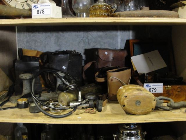 SHELF LOT OF ASSORTED COLLECTABLES; ARMY FIELD RADIOS, BEACON LAMPS, BINOCULARS, WOOD BLOCKS,