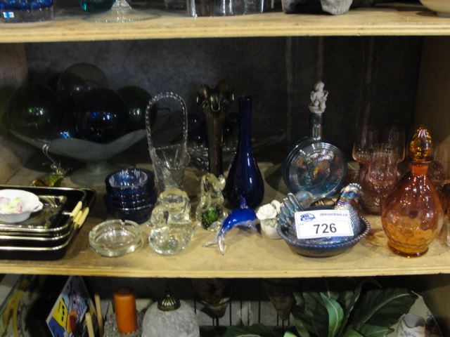 SHELF LOT OF ASSORTED COLLECTABLES, GLASSWARE, AND DECORATIVE HOUSEHOLD ITEMS