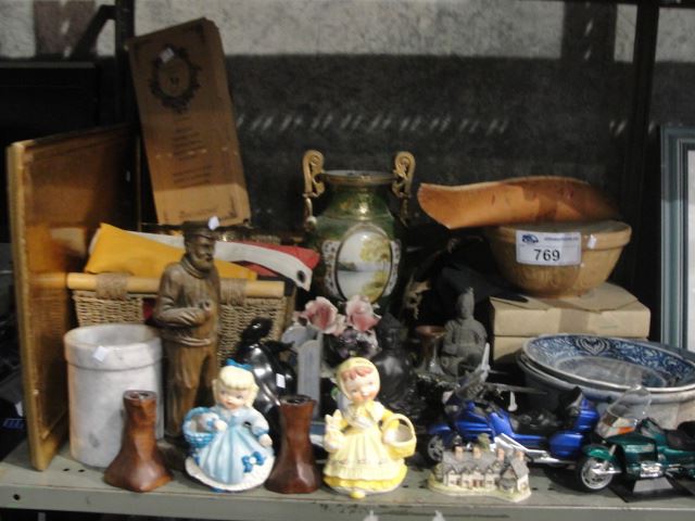 SHELF LOT OF ASSORTED COLLECTABLES MISC AND DECORATIVE HOUSEHOLD ITEMS; VASES, PLATES, ETC