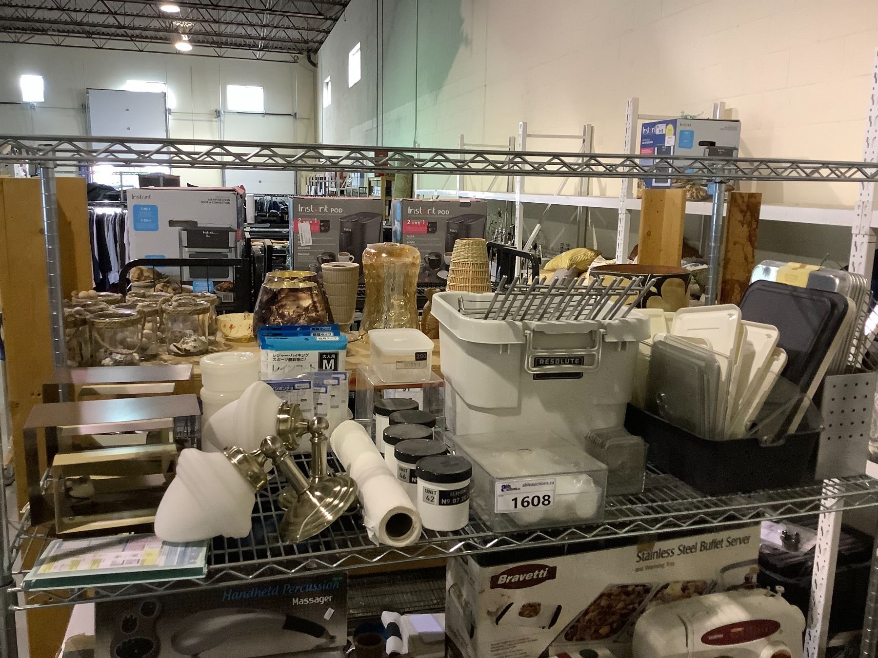 SHELF LOT OF ASSORTED CONTAINERS AND LIGHT FIXTURES