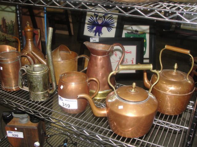 SHELF LOT OF ASSORTED COPPER COLLECTORS PIECES; OIL CAN, TEA POTS, JUGS, ETC