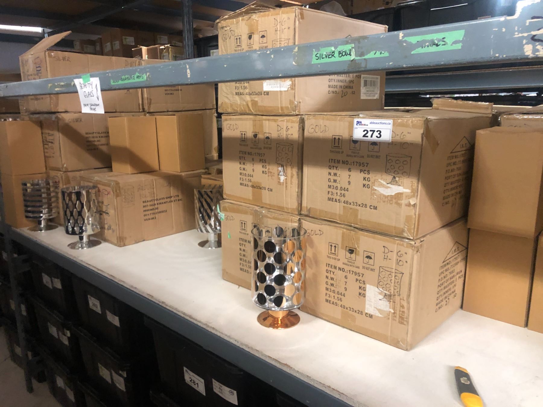 SHELF LOT OF ASSORTED DECORATIVE GLASSWARE INC. CUP POTS/VASES/PLANTERS AND MORE, VARIOUS COLOURS/STYLES/DESIGNS