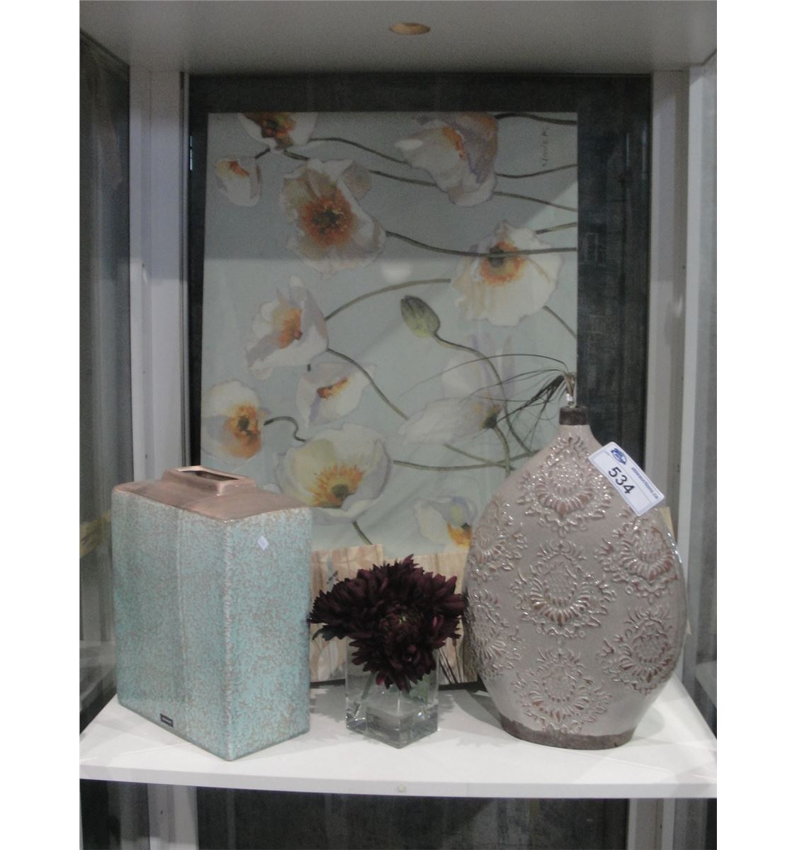 SHELF LOT OF ASSORTED DECORATIVE ITEMS; VASE, PITCHER, ARTIFICIAL FLOWERS, ETC