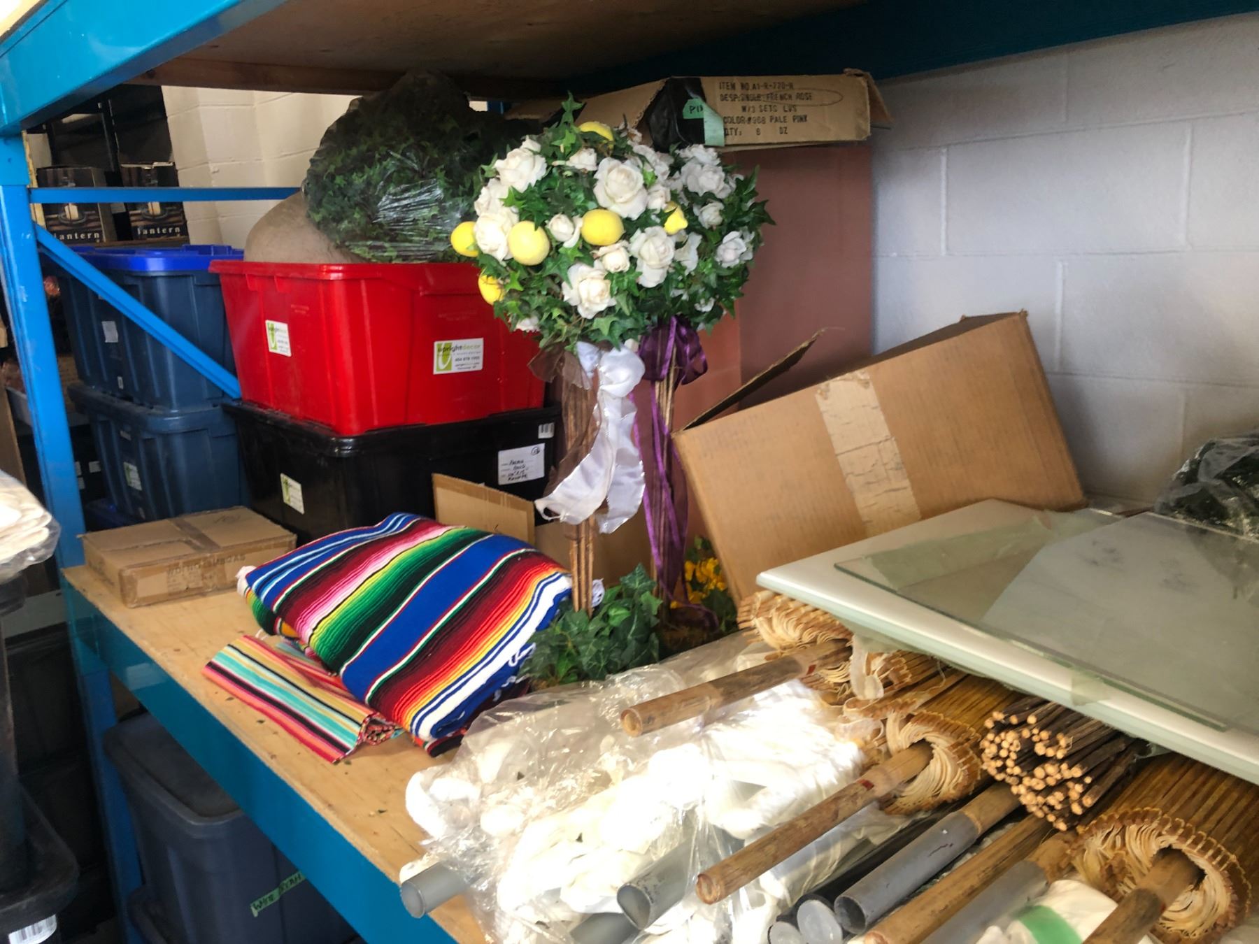 SHELF LOT OF ASSORTED DECORATIVE PLANTS, BAMBOO UMBRELLAS, MEXICAN BLANKETS AND MORE
