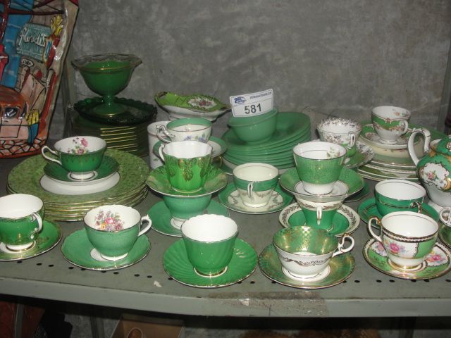SHELF LOT OF ASSORTED ENGLISH BONE CHINA; TEA CUPS AND SAUCERS, TEAPOT AND FIREKING JADITE PIECES, ETC