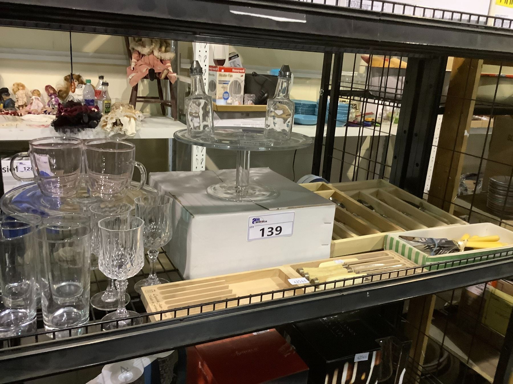 SHELF LOT OF ASSORTED FLATWARE, GLASSWARE, PASTRY SERVERS